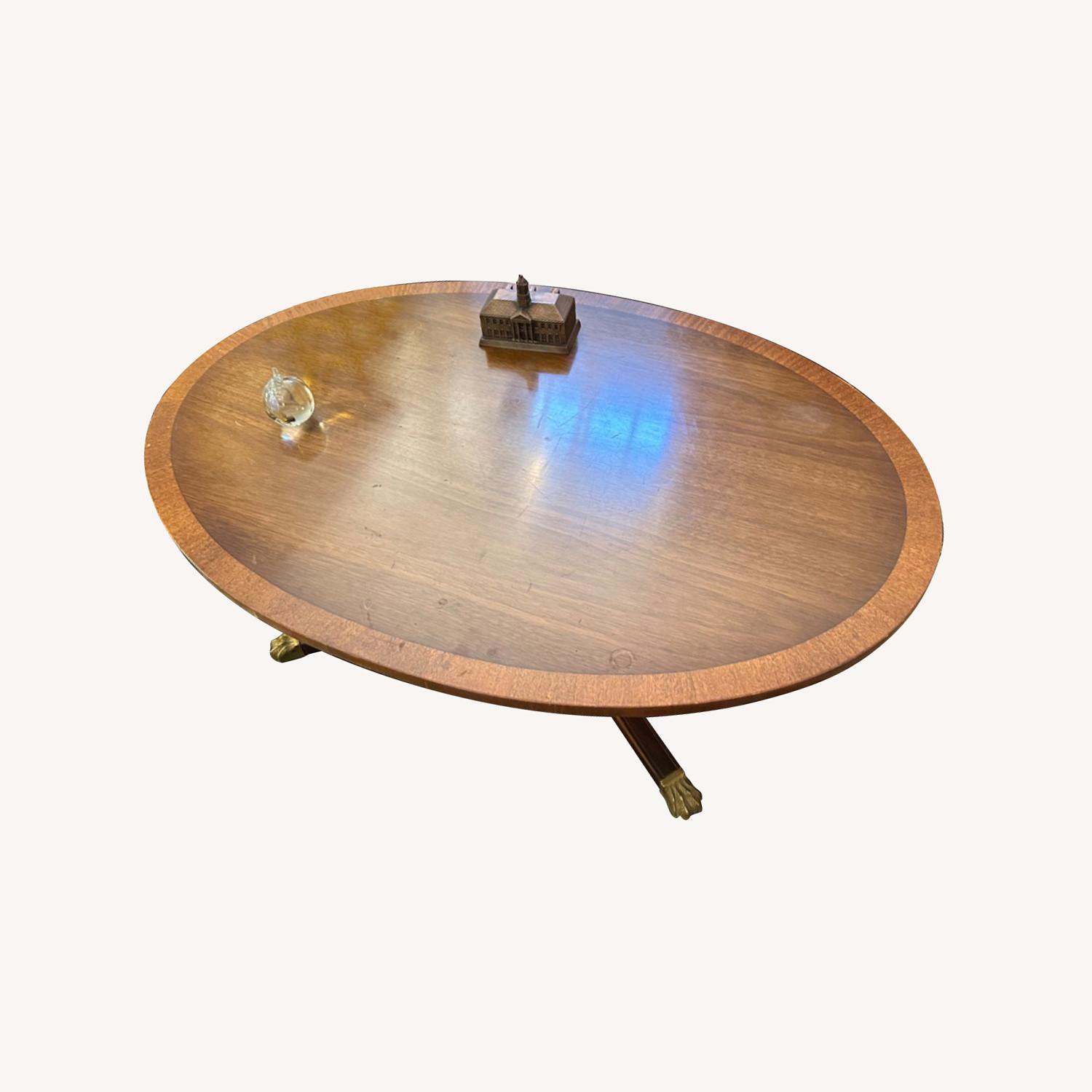 Seller's Notes:Antique mahogany oval coffee table inlaid in two colors of mahogany. Has brass lion claw feet on four wheels. MOVING MUST SELL. BEST OFFER