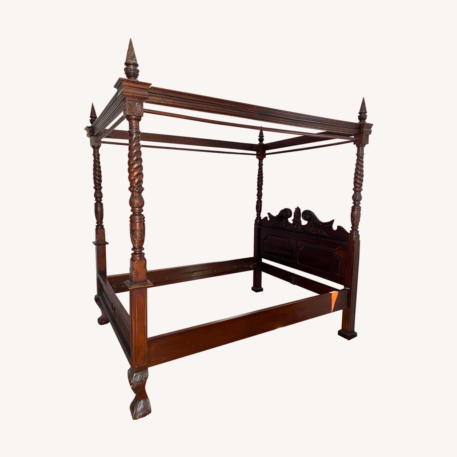 Seller's Notes:The bed frame is handmade from high-grade Mahogany wood. It is hand-carved on the headboard and pillars with intricate detailing. It has poles suitable for hanging drapes which gives the option of dressing the bed to suit the setting. Unfortunately, this bed frame does not come with slats where the Queen-sized mattress sits. It is in excellent condition; there are only three minor defects: 2 thin wood-checks (cracks) on the back of the headboard and 1 thin wood-check on one of the back legs. We bought this beautiful canopy bed brand new in an antique shop in Manhattan 20 years ago; it was shipped in from the United Kingdom.