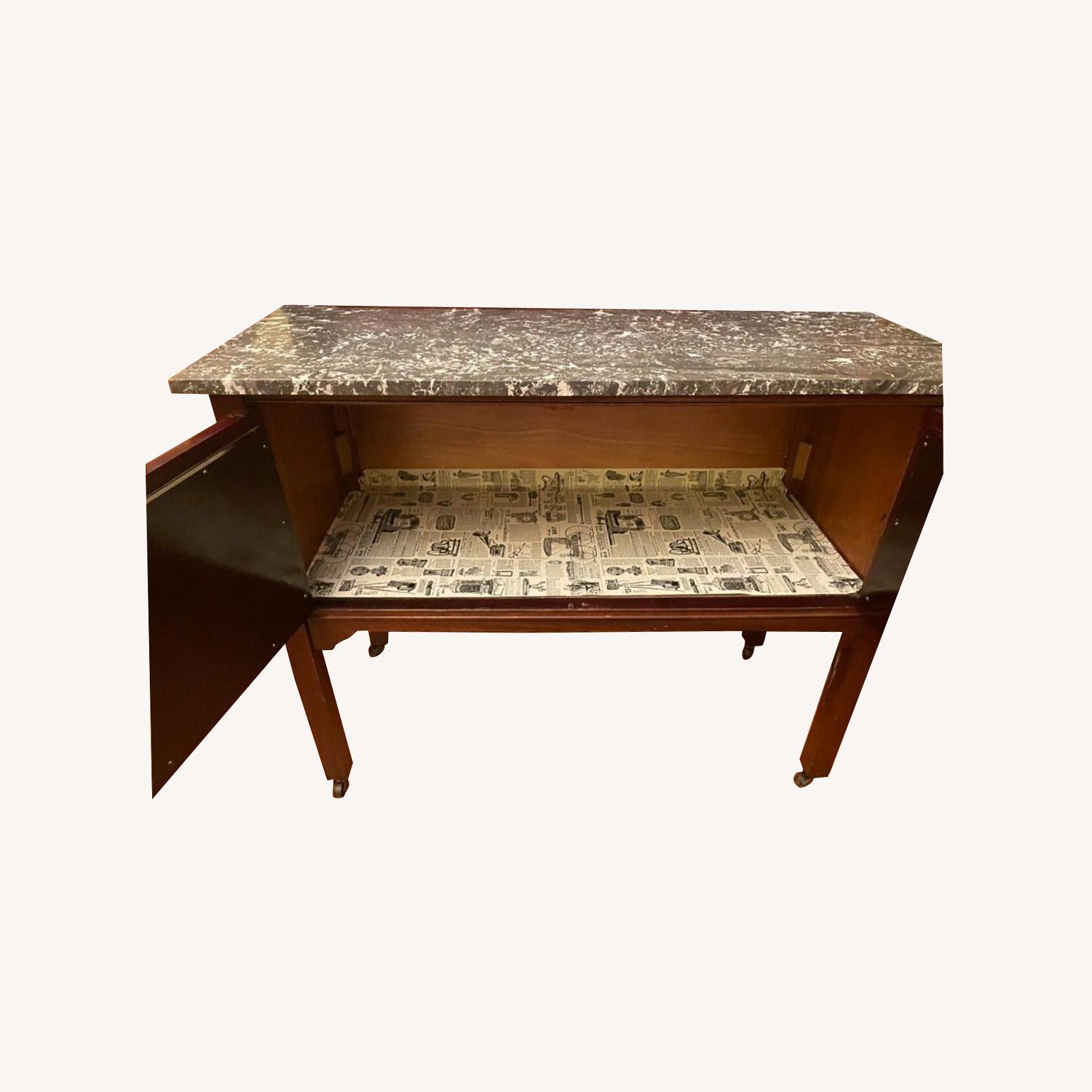 Seller's Notes:Solid wood, has wheels on all four legs. Backsplash measurements: H: 15 1/2; W-38 in addition to the listed measurements for the credenza itself. The Bottom compartment is roomy; it is covered in old contact paper which can be easily removed. Marble impeccable on both the credenza and backsplash. Side panels: one of them is discolored-can be easily restored; the wood on the other one has 4 screw holes (towel rack) which can be covered with putty and painted. PRICED TO SELL. Pick up from Morningside (10026) from an elevator building.
