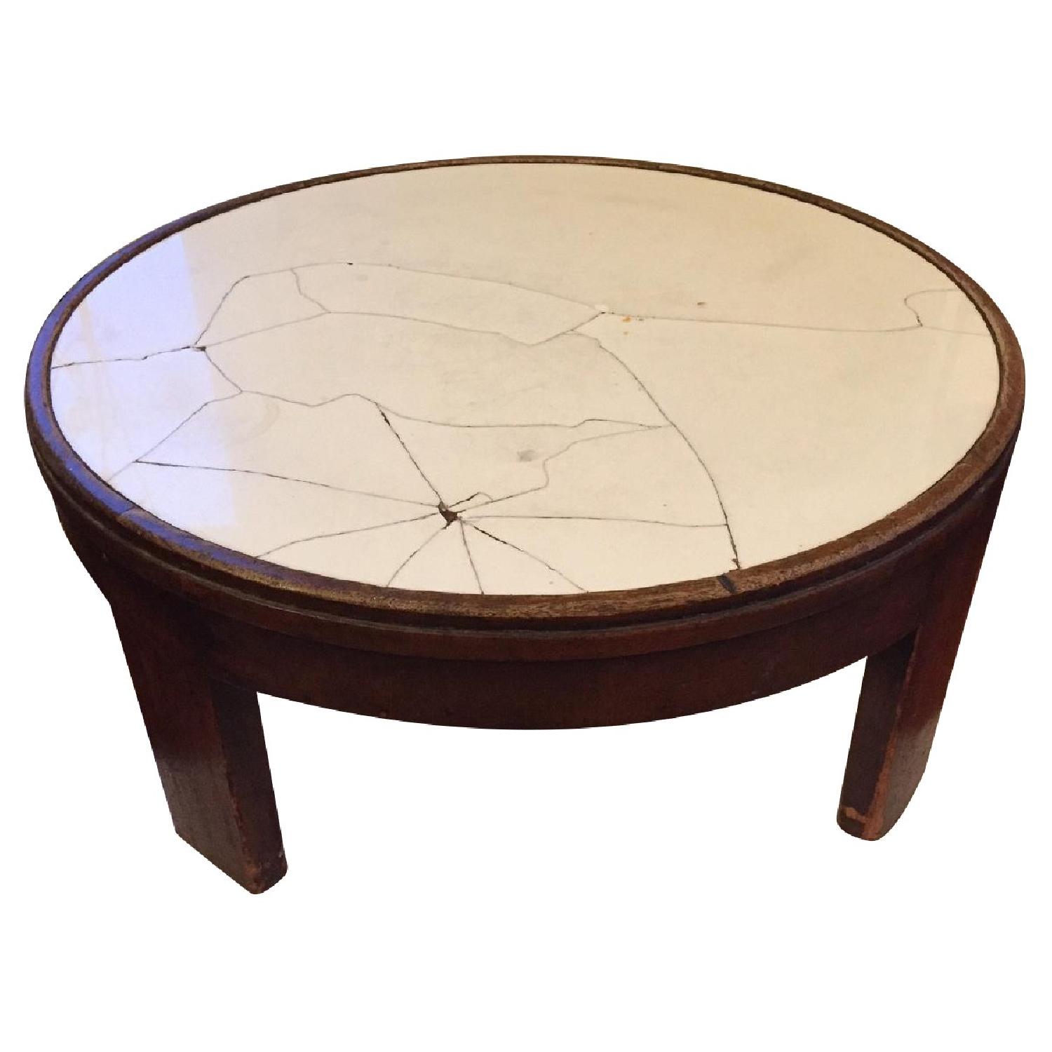 Seller's Notes:This round table is a low coffee table with white marble recessed into the wood. The marble is cracked. It has a distressed look which I find appealing.
