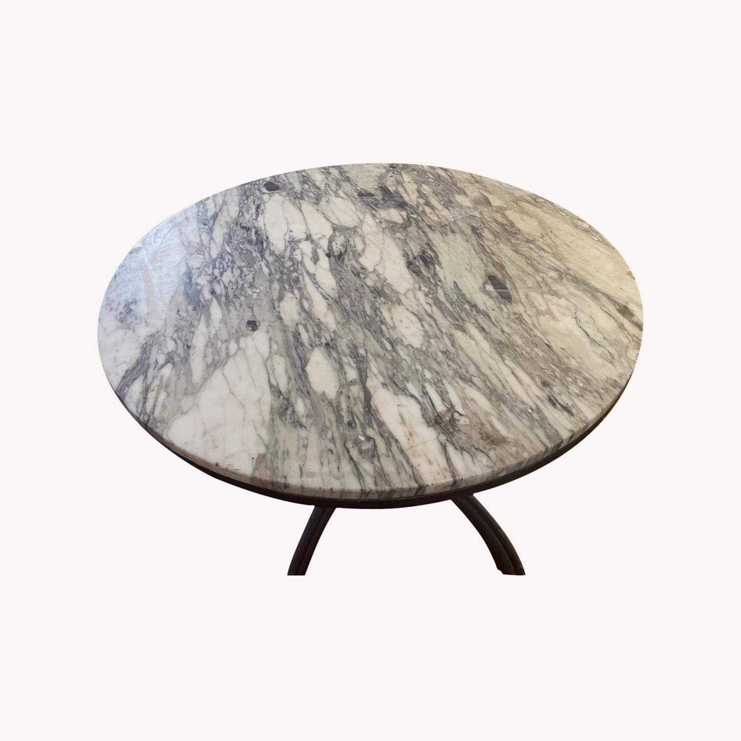 Seller's Notes:Beautiful table for a lamp, photos, fruit and art. Not meant for eating because of the wood work below table. No leg or knee room! Perfect for entrance to put mail on etc. Marble is in excellent condition.