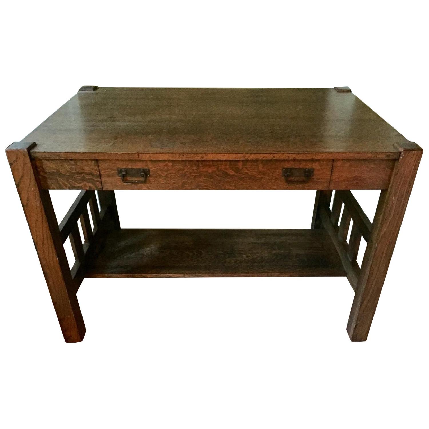 Seller's Notes:I'm moving to Germany and am looking to sell this beautiful antique Mission-style desk. It's a solid hardwood desk (I believe it's quarter sawn oak) with one large drawer and a board that you can use for decorative objects, storage or for resting your feet. I bought it at an antique shop two years ago and polished/refinished it. Very minor scratches only, in excellent condition overall.