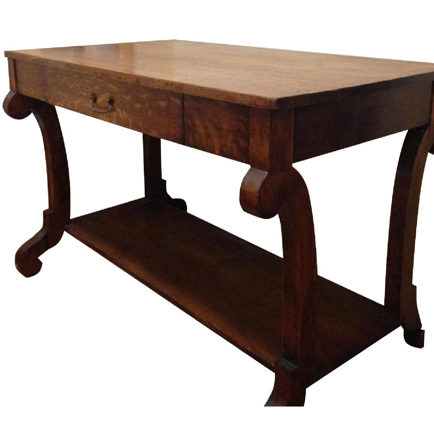 Seller's Notes:-Beautiful, large oak desk in great condition -single drawer in the middle with a book shelf underneath -Legs disassemble from desk top and shelf making moving easy!