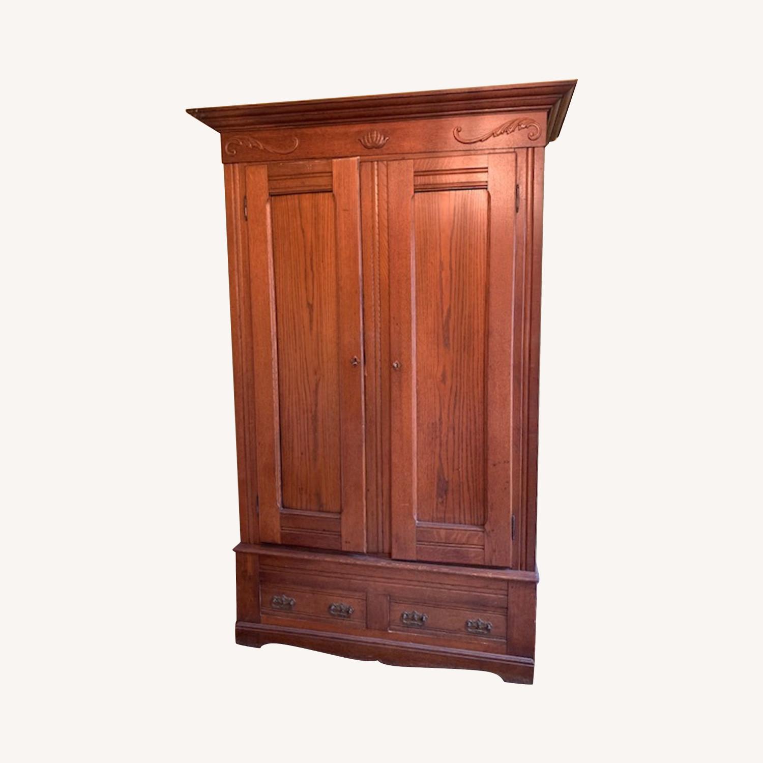 Seller's Notes:This antique oak wardrobe has been refinished, and is in good condition. It was made when these pieces were moved around the country, so it easily comes apart for purposes of moving it. It has 2 drawers and 5 shelves.