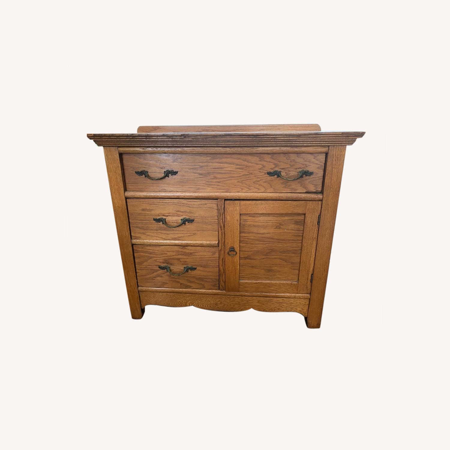 Seller's Notes:Beautiful decorative antique oak wash stand from the early 1900s that can be used as a table or cabinet. Great condition. Featuring a cabinet with 2 shelves as well as 3 drawers- 1 long drawer across the top and 2 drawers along the side. Additionally there is a cutout in the back for wires from when this was used as a TV stand years ago. Overall Dimensions: 31.75” length x 16.25” wide x 28.5” tall.