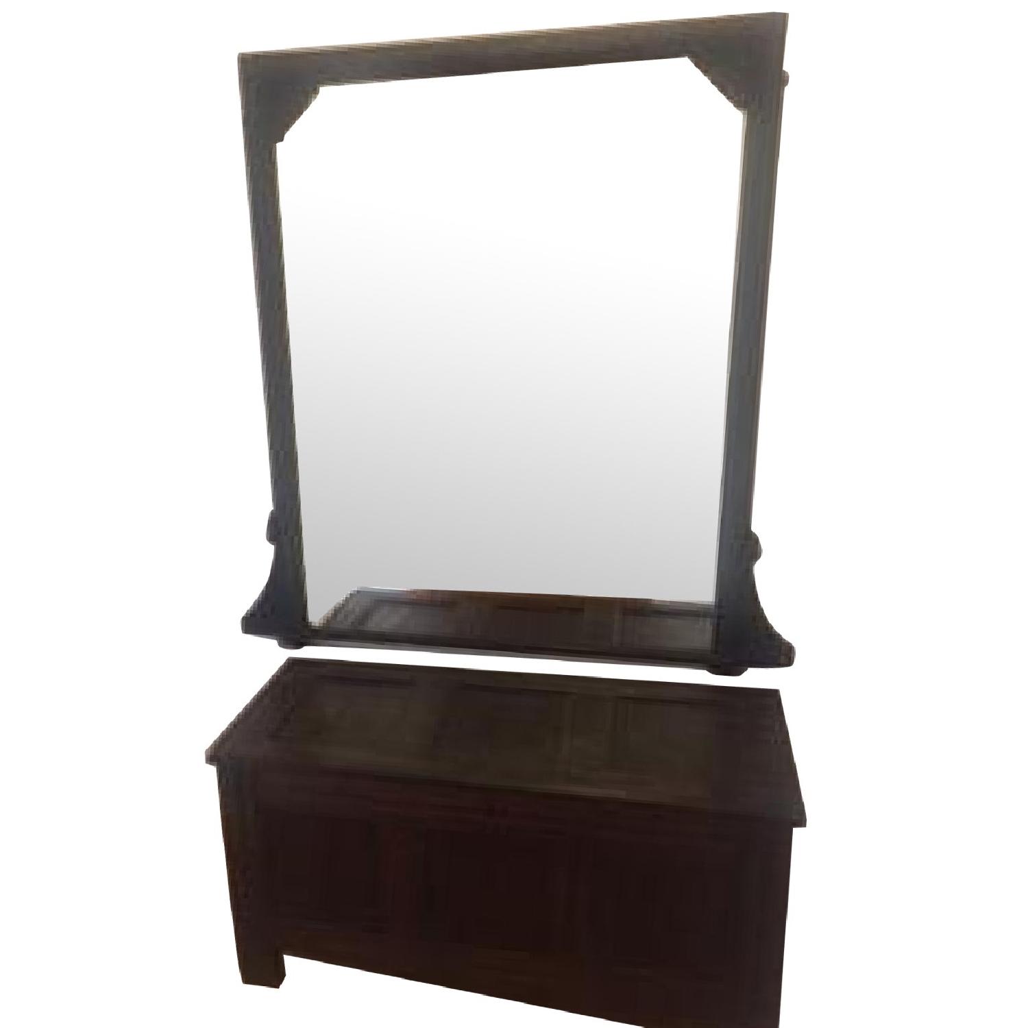 Seller's Notes:This large mirror is designed to stand on a shelf. The dimensions of 53" x 53" are the overall measurements, including decorative border, lugs and feet. The actual glass in the mirror is 38" x 49.5". The mirror rests on small, domed feet (photo 3) and is then secured to the wall by screws (photo 4). There is decorative plaster molding on the wooden frame as well as in the bottom outer edges of the frame (photo 3) and the top inside corners of the mirror (photo 4). This has been painted black but could be picked out in gold. There are a couple of spots on the mirror but in general the glass is in good condition. Selling because I am moving to a studio where this will not fit.