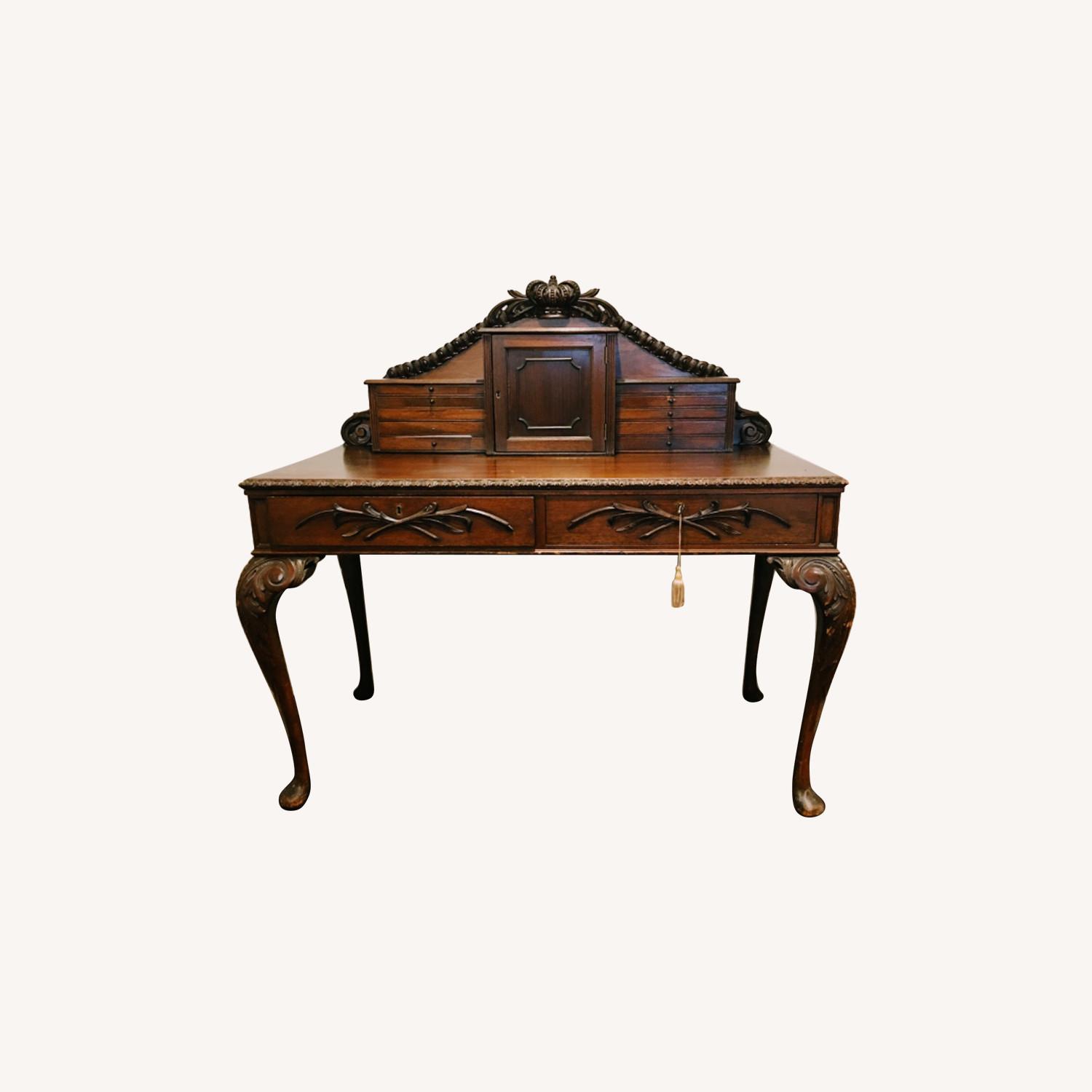 Seller's Notes:Antique Queen Anne’s writing desk with hutch, hand carved detailing and turned supports. Two drawers on bottom with metal keyholes and key with original tassel. Hutch has ten pull-out tray drawers and center swing door compartment. Age appropriate wear. Minor surface wear. Originally purchased from an antique dealer in Lambertville, NJ. Overall Dimensions: 53”(H) x 48”(L) x 24”(D)x 31”(H) + 18”(Hutch Height)