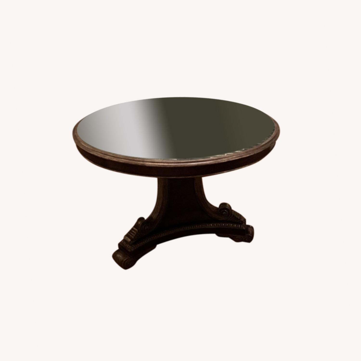 Seller's Notes:Custom Dining Table is dark walnut with silver leaf accents & antique mirror inset top. Excellent Condition.