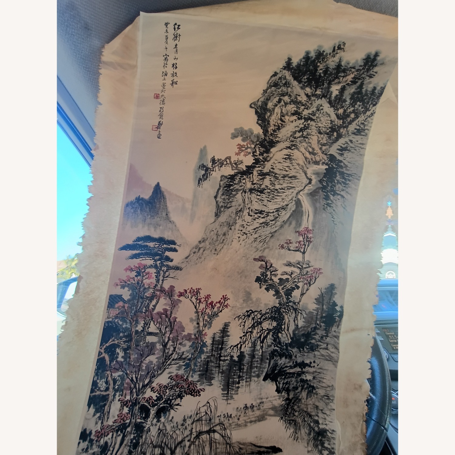 Seller's Notes:Antique scroll beige and green landscape