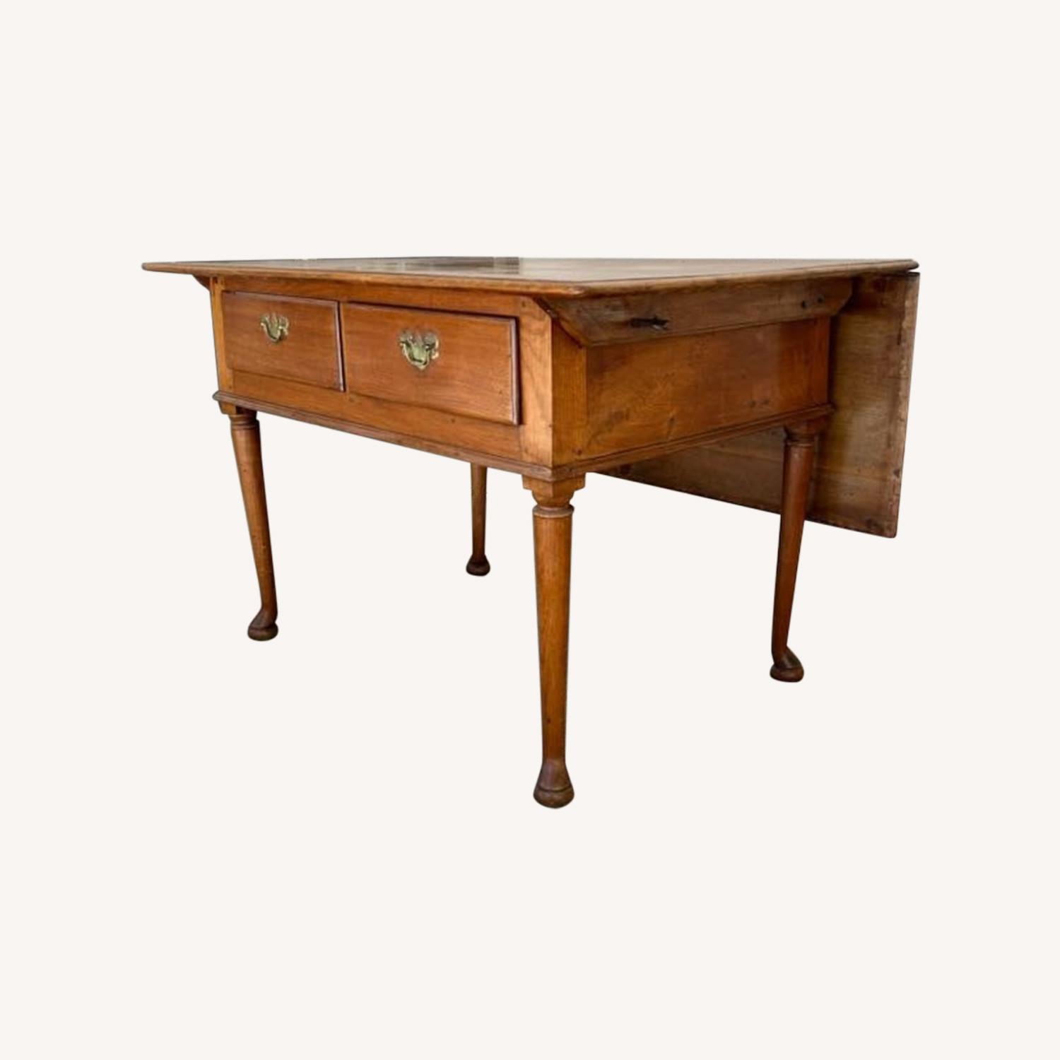 Seller's Notes:This item sat in my great-grandparents' house (that then became my grandparents' house) in Virginia. It's been in my family since at least 1926. When the drop leaf is extended, the full depth of the table is 46.75". On either end of the table is an area to insert spindles for winding yarn. There are three original spindles. There are some scratches on the top surface. I would love for it to go to a wonderful, loving home!
