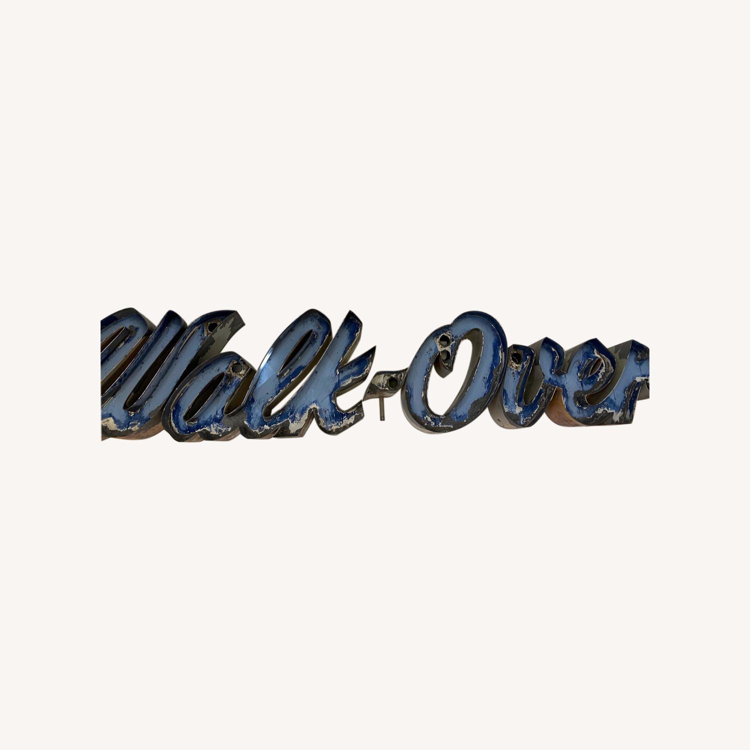 Seller's Notes:This sign was salvaged off a building set for demolition about 30 years ago in Salt Lake City. It sat on the edge of a metal awning over the door. It was originally for neon but the electrical and tubes had been removed years earlier. I believe it is aluminum and was once blue and maybe white. Walk-over is a classic American shoe company that is/was in business for 250 years. Their website is still active but they have no product for sale so not sure is they are still producing shoes or will in the future. The letters are hallow and surprisingly light weight. Walk-Over is 19” tall, 7” deep and about 90” long. It was mounted to a long heavy metal electrical housing that I removed for easier storage and transport. So the letters are now in 5 pieces - W, alk, hyphen, O, ver - are all separate pieces. Shoes is 5 smaller separate letters that hung below on the edge of the awning. They are 10” tall x 5.75” wide x 1” deep. Other than the peeled faded paint there is no damage, holes or dents.
