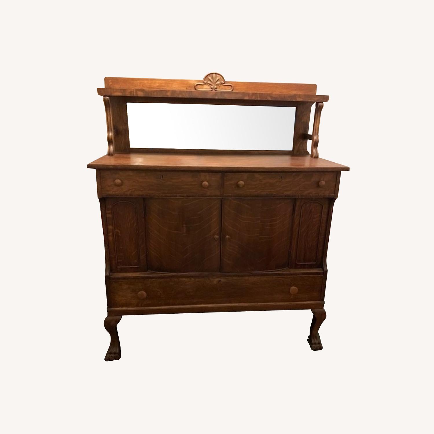 Seller's Notes:Handsome antique oak buffet with elegant details including claw feet, mirrored back and slightly rounded front doors. Slight discoloration on right side that can easily be touched up.