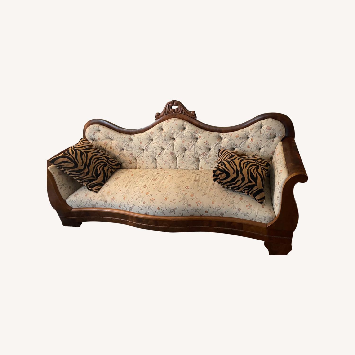 Seller's Notes:Cream colored with beautifully embroidered vines and delicate coral colored blooms, this sofa is a vibe. To be honest the fabric could use a deep clean, but is in good condition for age.