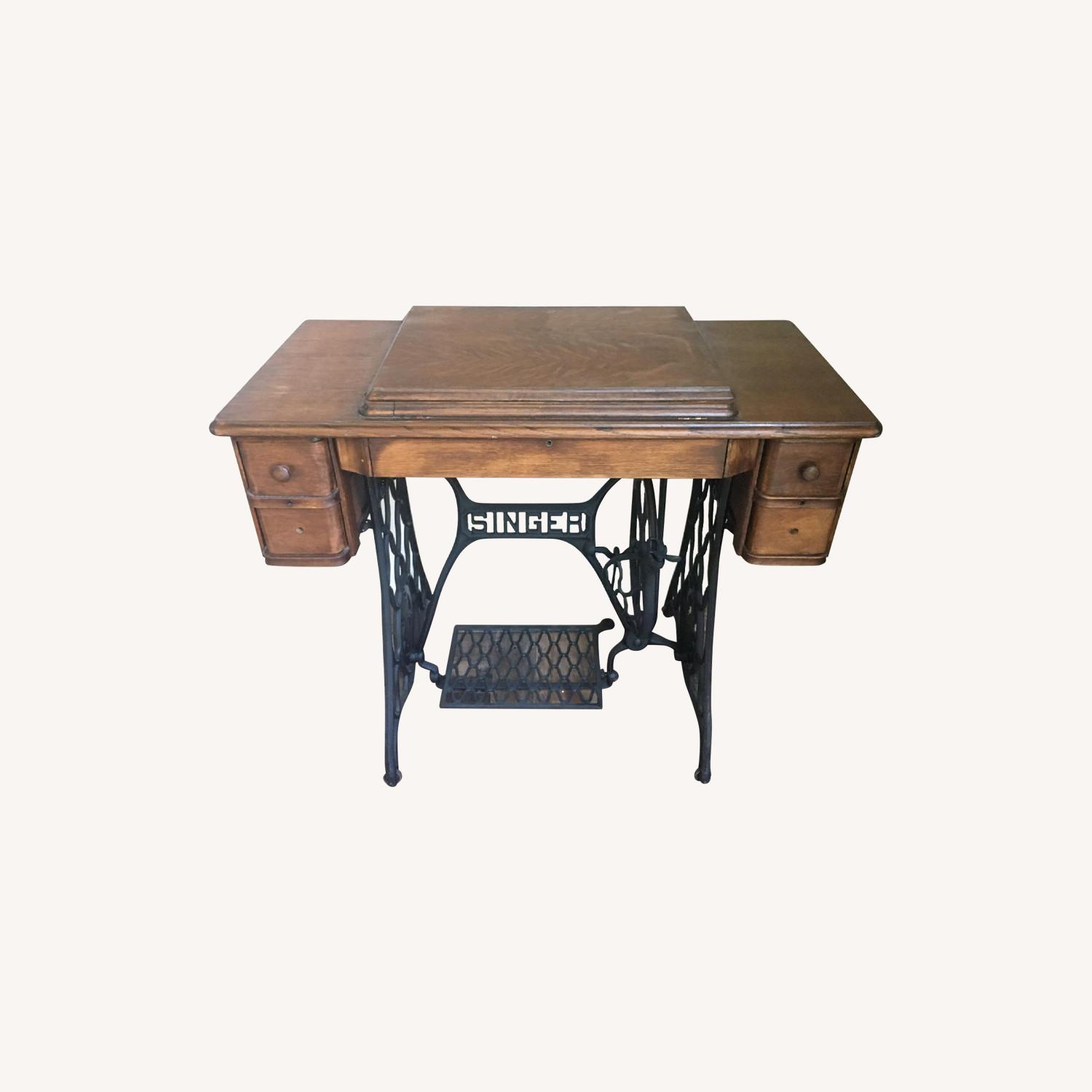 Seller's Notes:Antique singer working treadle could be used as a side table Great conversation piece Manufactured in the 1930s in Elizabeth NJ Missing bottom drawer knobs Some minor veneer damage as shown in pics and some swirling Base is in beautiful condition *NOT WORKING*