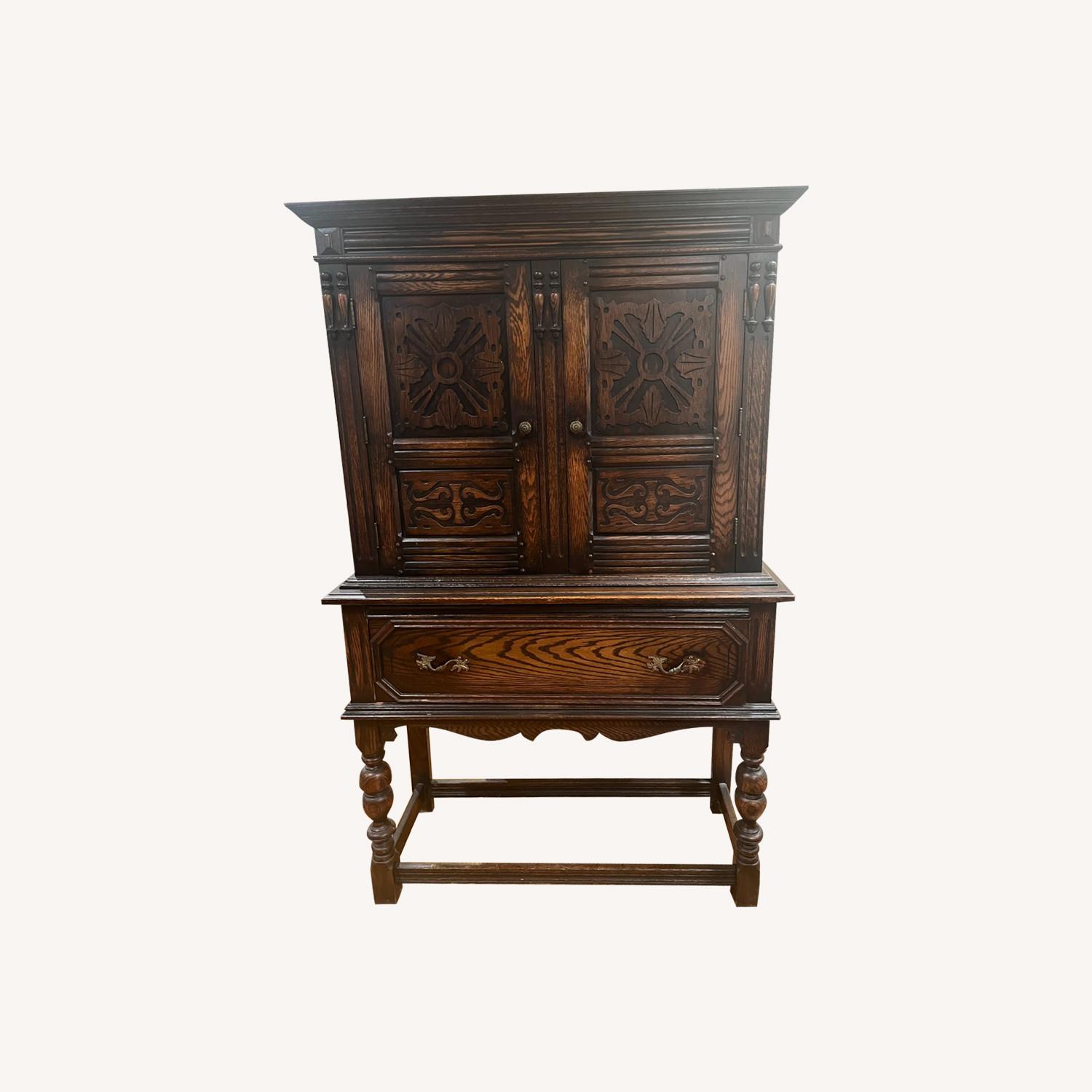Seller's Notes:Elegant standing cabinet crafted from vintage solid wood, featuring generous storage capacity. Ideal for use as a liquor cabinet, a sophisticated addition to your dining or living room, or as a stylish linen press. Impeccable condition with exquisite carved details. Additional Dimensions: Top Doors- 25 1/2 " H 14 1/4" W 12" deep Bottom Drawer- 11 1/2" deep 32 1/4" wide 8" high