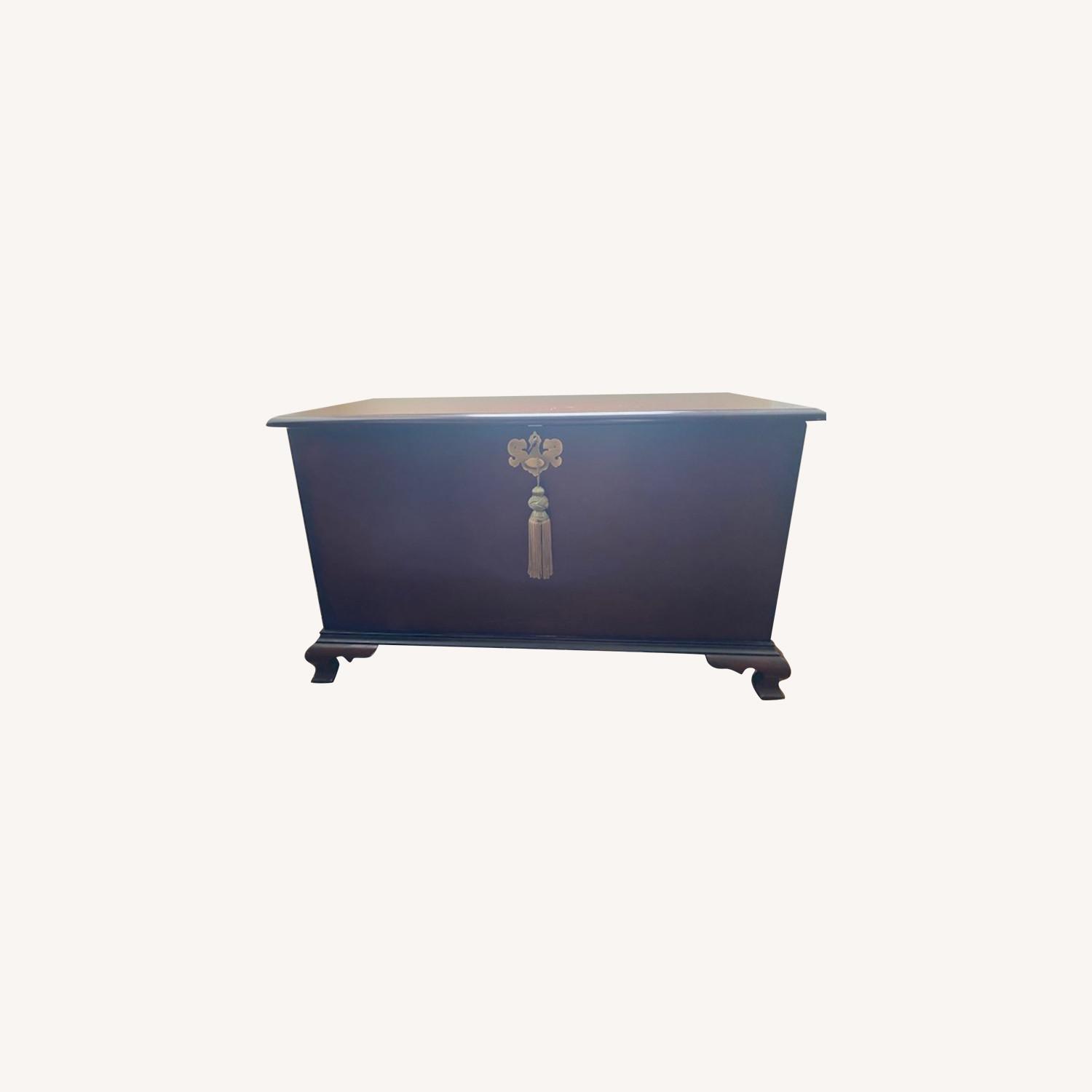 Seller's Notes:We bought this chest at an antique store a few years ago, it came with the scratches on the top- no additional damage to the piece. Has a lock and key with tassel so you can keep this piece locked at any time. it stores a lot inside. It is solid wood, very well made.
