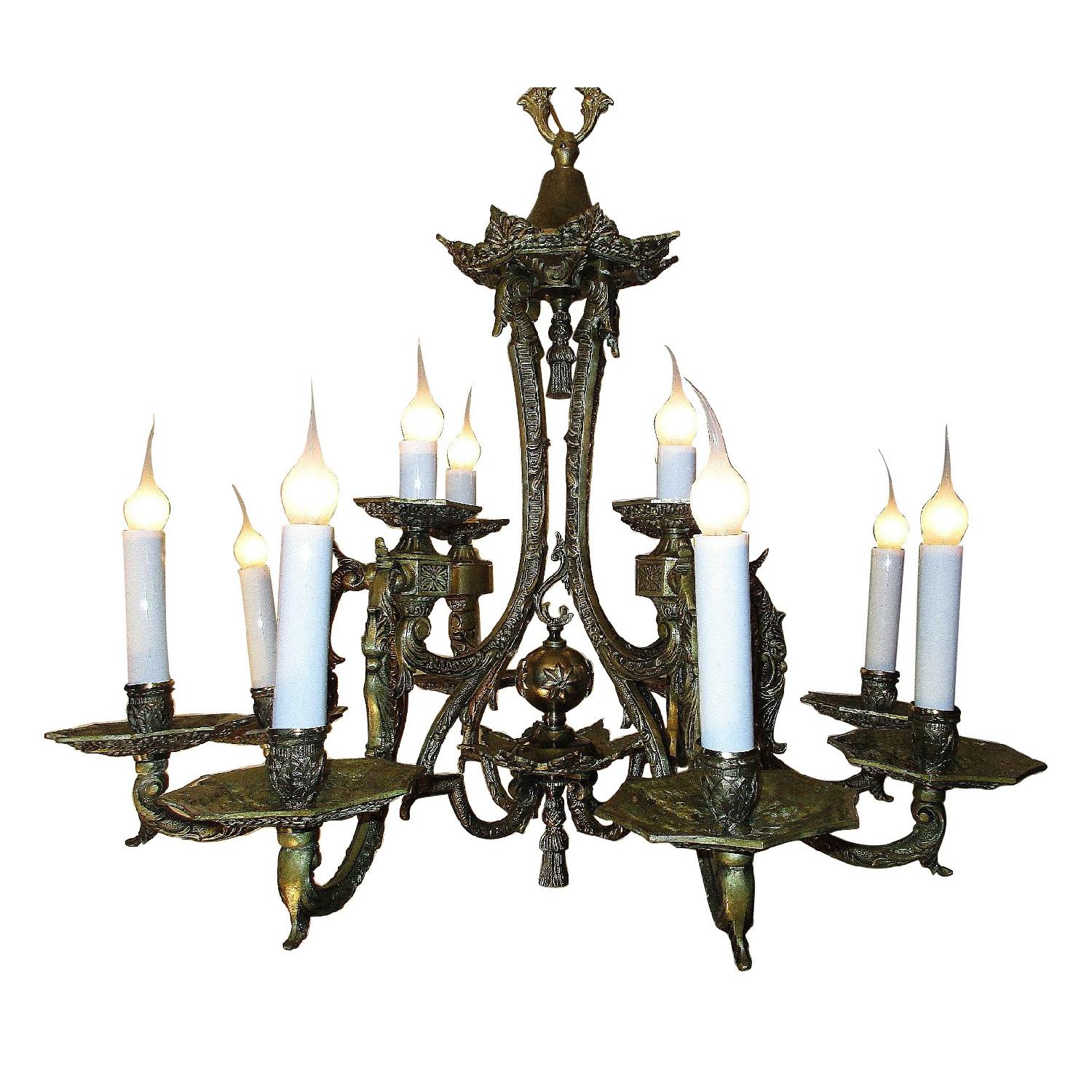 Seller's Notes:This is an incredible antique chandelier. It is a Spanish bronze twelve light with octagon bobeches. You have to take a look at the bronzework. It has such detail and looks to be inspired by seahorses. This is a lost art. In the center on a bronze ball with stars sits what looks to be a seahorse ( to me anyway). This chandelier has 12 lights of the candelabra style. This has details all over, just think about the craftsman who made this 80 plus years ago working with what to us would be primitive tools in a hot steamy bronze casting workshop.