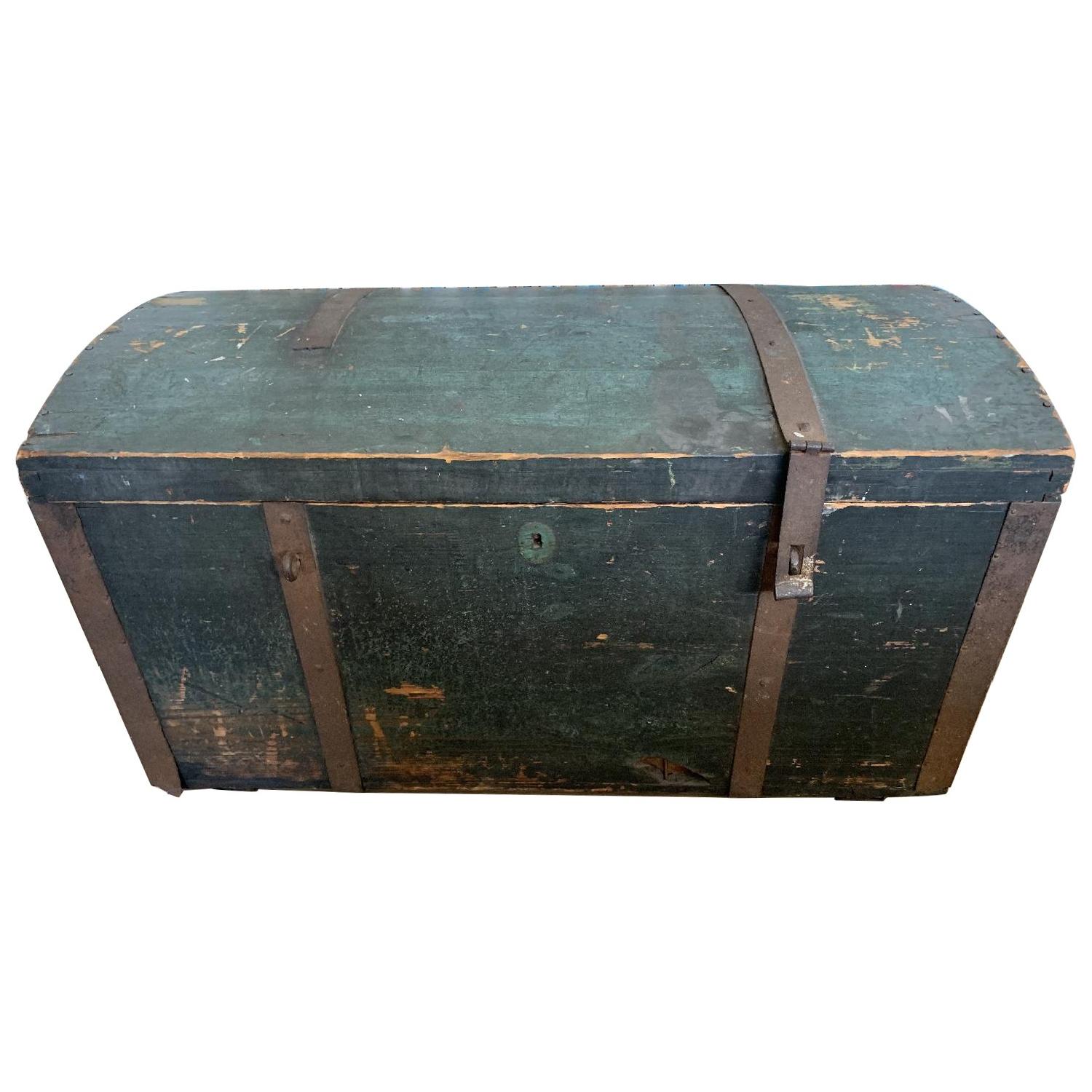Seller's Notes:Age-worn trunk with tons of character. Green/blue faded exterior makes for a unique vintage storage piece.