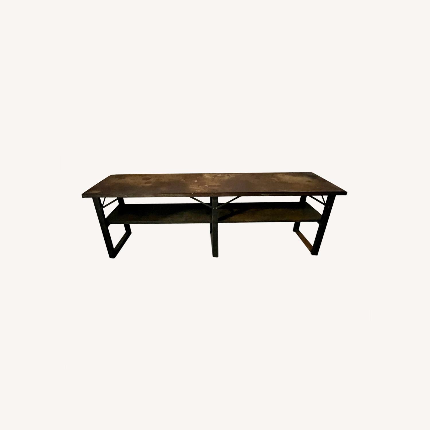 Seller's Notes:Beautiful, antique steel table with masonite top, with very sturdy, bolted construction. Two steel shelves are mounted underneath at 19" height. Very high quality and eye catching piece. Would be an incredible work bench, side board, or piece for retail display. Has been previously used in textile studios, but we are moving and sadly can't fit this beauty into our new space. Please inquire with any questions. 102" length x 34.5" height x 24" width