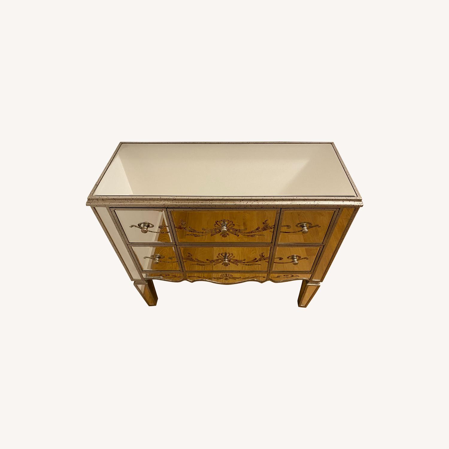 Seller's Notes:Multi-drawer wood dresser with mirrored exterior and intricate painted design along the front. Six drawers—two larger in middle and four smaller on either side—provide for extra storage in entry-way, hallway or bedroom. This item is in great condition and has been carefully and minimally used. Comes with extra drawer pull. No assembly required.
