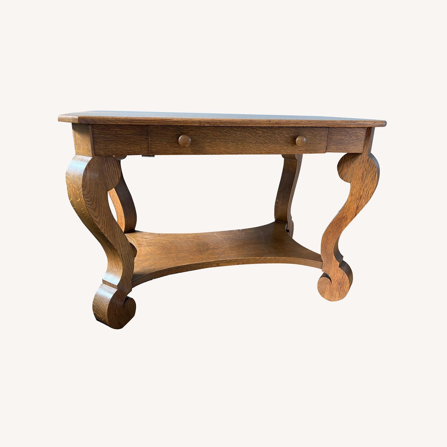 Seller's Notes:Purchased from a private owner in Lake City, Michigan and owned for approximately 9 years. Ready for a new home! No smoking in our home, we do have a dog (doodle). There are no odors. Well-cared for, beautiful piece of history, estimated age about 100 years old. Some surface scratches on lower shelf, and some small "dings" on top, consistent with age/wear, adds patina. No manufacturer info found. Some stamped numbers as pictured. This is an antique American Empire or Victorian-style library table made from quarter-sawn or "tiger" oak. These tables were popular in the late 19th and early 20th centuries and are characterized by their distinctive, heavily curved or scrolled legs, often referred to as "S" curve supports or ogee feet. Key Features Style: American Empire or Victorian, also sometimes associated with Mission or Craftsman styles due to the oak material. Material: Quarter-sawn oak, known for its prominent, decorative grain patterns (ray flecks), giving it the "tiger oak" appearance. Design: The table features a single, shallow center drawer with wooden knobs and a lower display shelf or stretcher base, designed for functionality in a library or living room. Legs: The defining feature is the large, ornate, and scrolled legs that provide stability and a unique aesthetic. These pieces are often considered functional and decorative antiques, typically used as console tables, sofa tables, or desks. Thanks for looking!