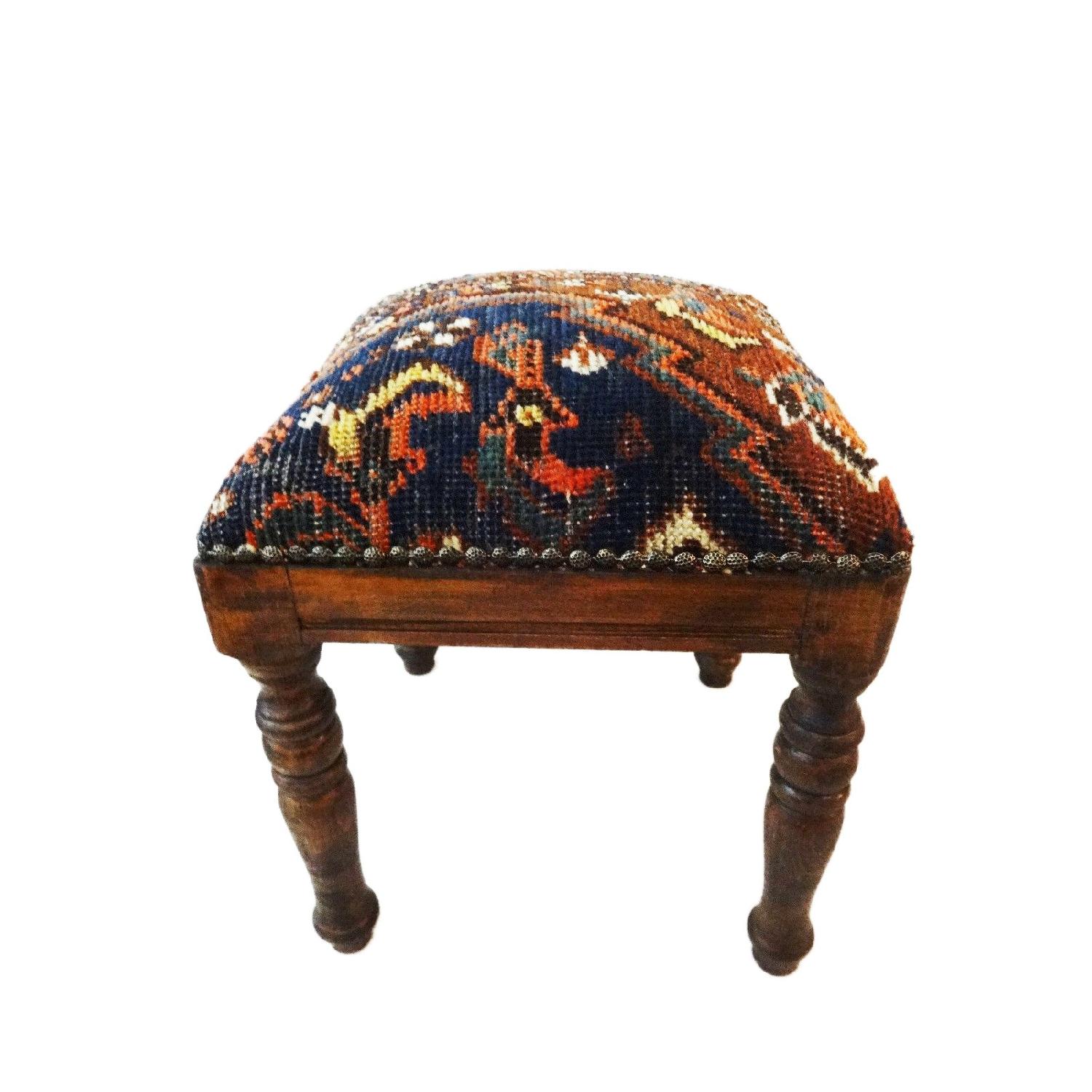 Seller's Notes:Superb square wood stool newly upholstered in a superb antique geometric/floral handmade tribal qashqai rug, circa 1900. Low pile. measures approx 17" h by 14" w by 14" D 8 pounds very strong structure and very comfortable to seat