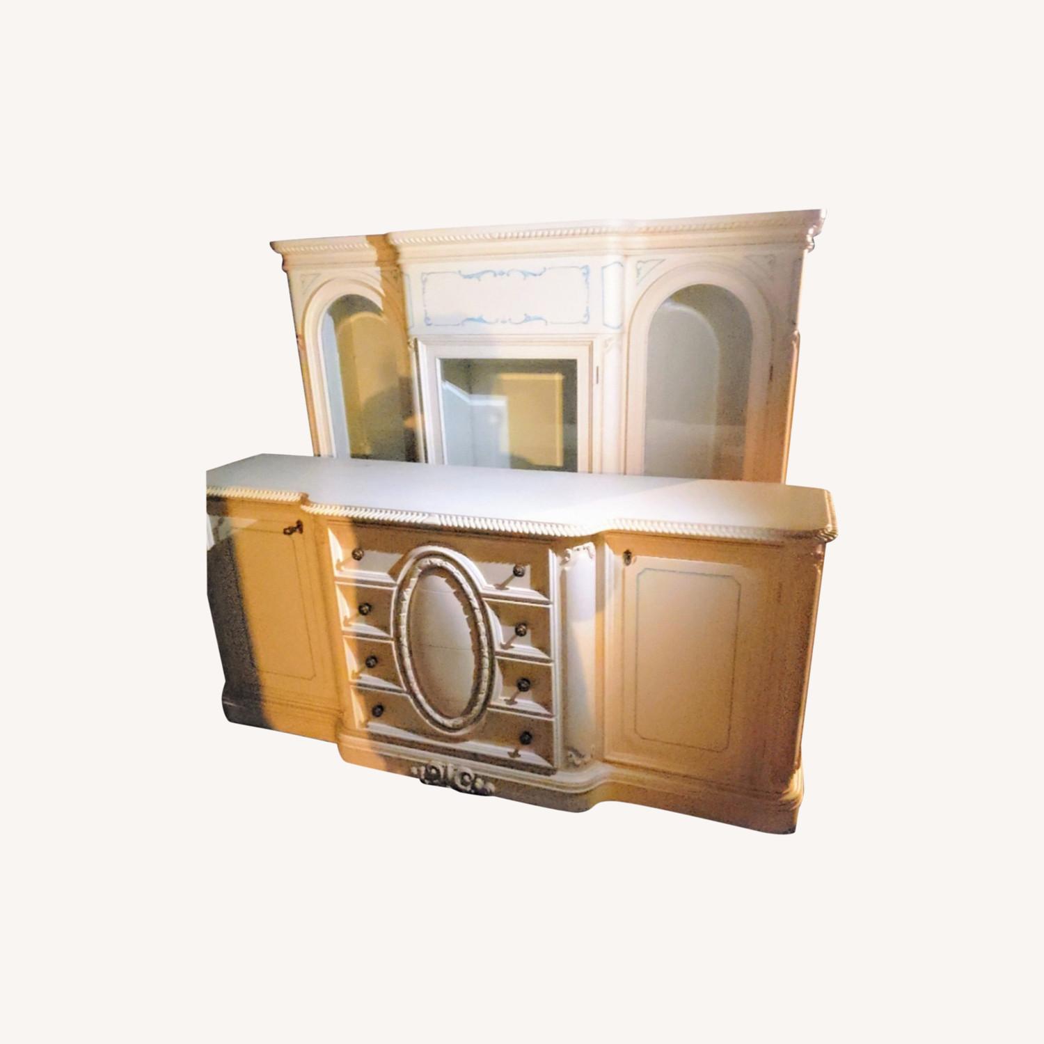 Seller's Notes:I purchased this hutch for myself 2 years ago. However I cannot fit it in my small one bedroom apartment it's about 9 ft tall 6 ft across. It lights up with lighting at top of hutch with 2 skeleton keys for doors and cabinets, golden rope lined inside glass cabinet doors, glass shelves are included although it might not be in the photos, and hand-painted with baby blue trim accents. Previous owner took very good care of this hutch...It's been in my storage since I purchased, untouched.. It's in excellent condition!! Price is negotiable. Make me an offer!