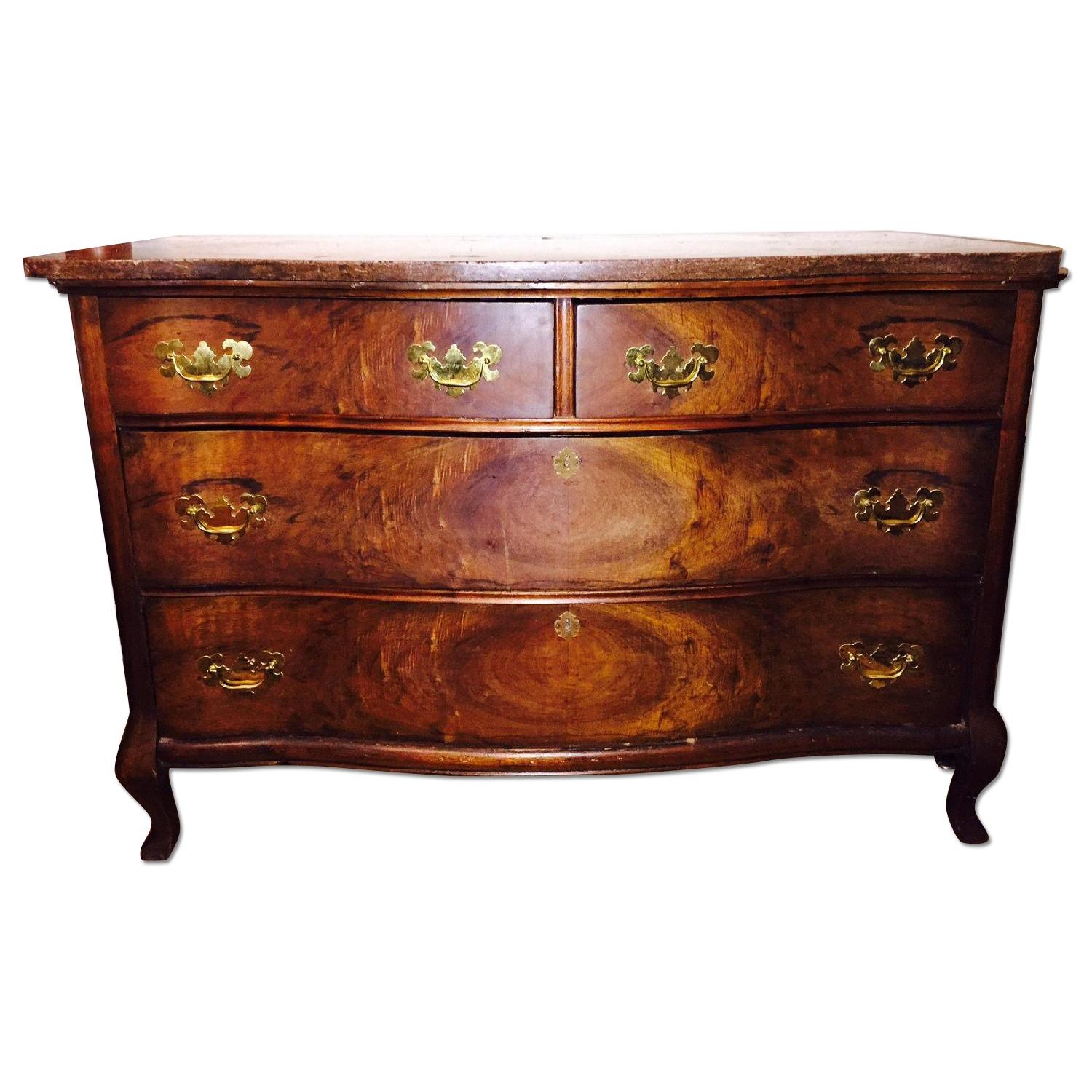 Seller's Notes:My mother rescued this from an old antique truck. She had it restored by a professional and we've enjoyed it as long as I can remember. It has 1" thick German marble on top of walnut bow front with burl detail down all drawers. The feet are short queen anne style. It is a piece to delight the eyes. We are moving and must downsize so selling. There is a faint circular mark from what must have been a plant on the marble back corner - see pic.