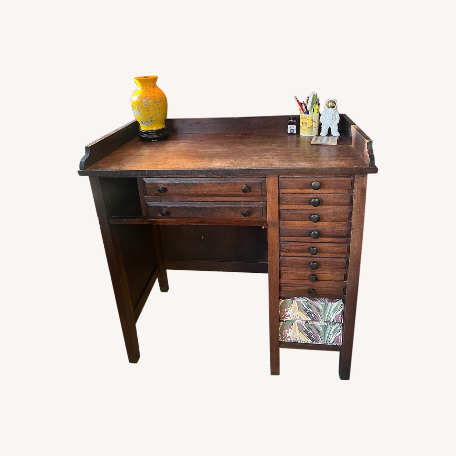 Seller's Notes:Beautiful antique desk handmade for watchmaker or jeweler with generous space and storage. Great condition, old walnut wood piece with plenty of drawers (10, plus storage space). Perfect for writing or work desk, standing or sitting. Very solid, and a bit heavy. Will need help carrying downstairs. Very sad to get rid of it, but need space for nursery.
