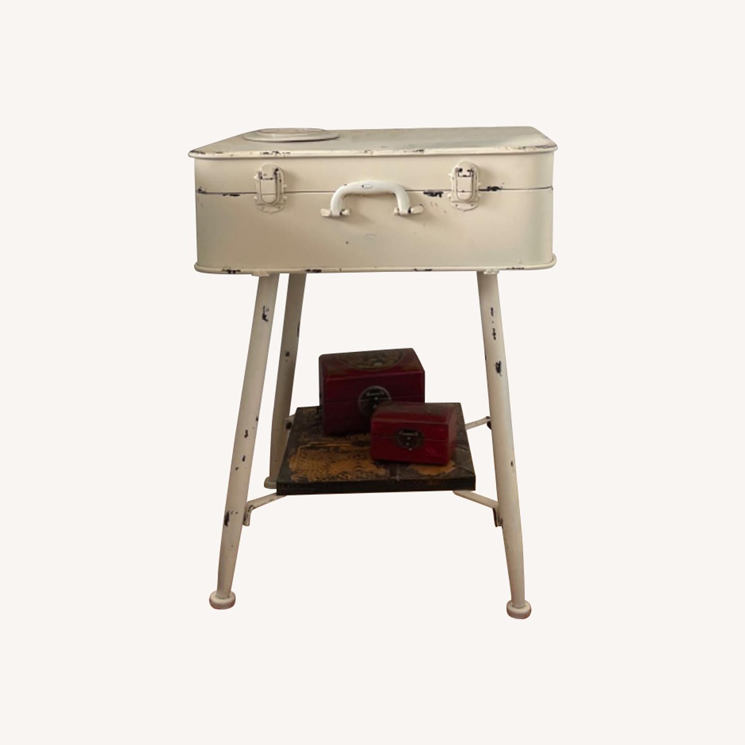 Seller's Notes:Bought this side table a year ago, but I’m moving to Europe and getting rid of all my furniture. The table is in excellent condition. It opens up like a suitcase with storage depth of 6”. It’s metal with a purposefully distressed, cream colored paint look.