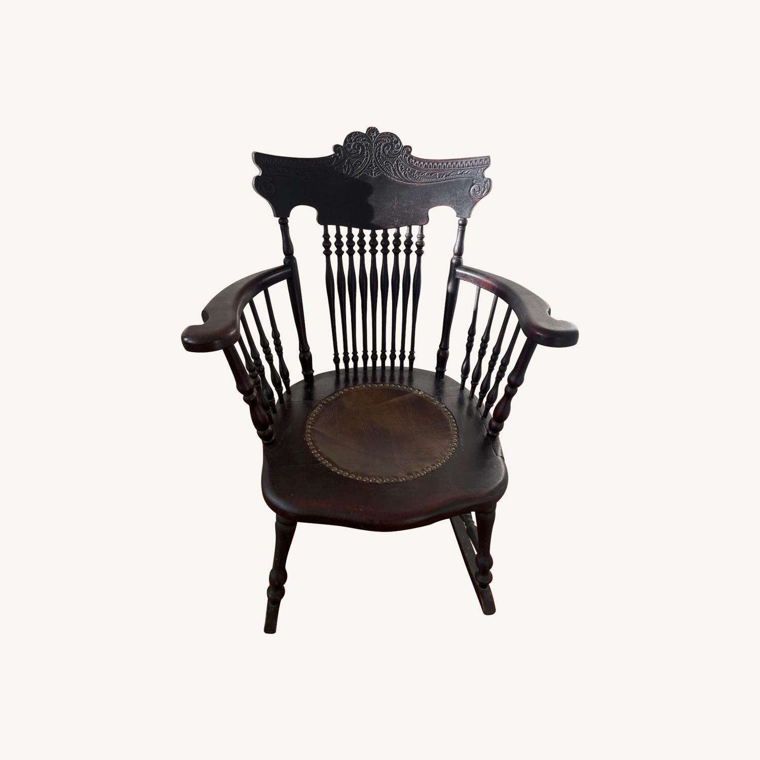 Seller's Notes:Functional Victorian era rocking chair made of stained wood with leather seat. Details include a shaped toprail incised with addorsed scrolls over nine slender baluster spindles and similar spindle-supported out-scrolled arms above a padded seat on splayed baluster legs with stretchers. This is inspired by Windsor chairs of the 18th and 19th centuries and with its very slender turned details, reflects some of the prevailing Arts and Crafts style of the late 19th century. The timber may be stained birch or ash.