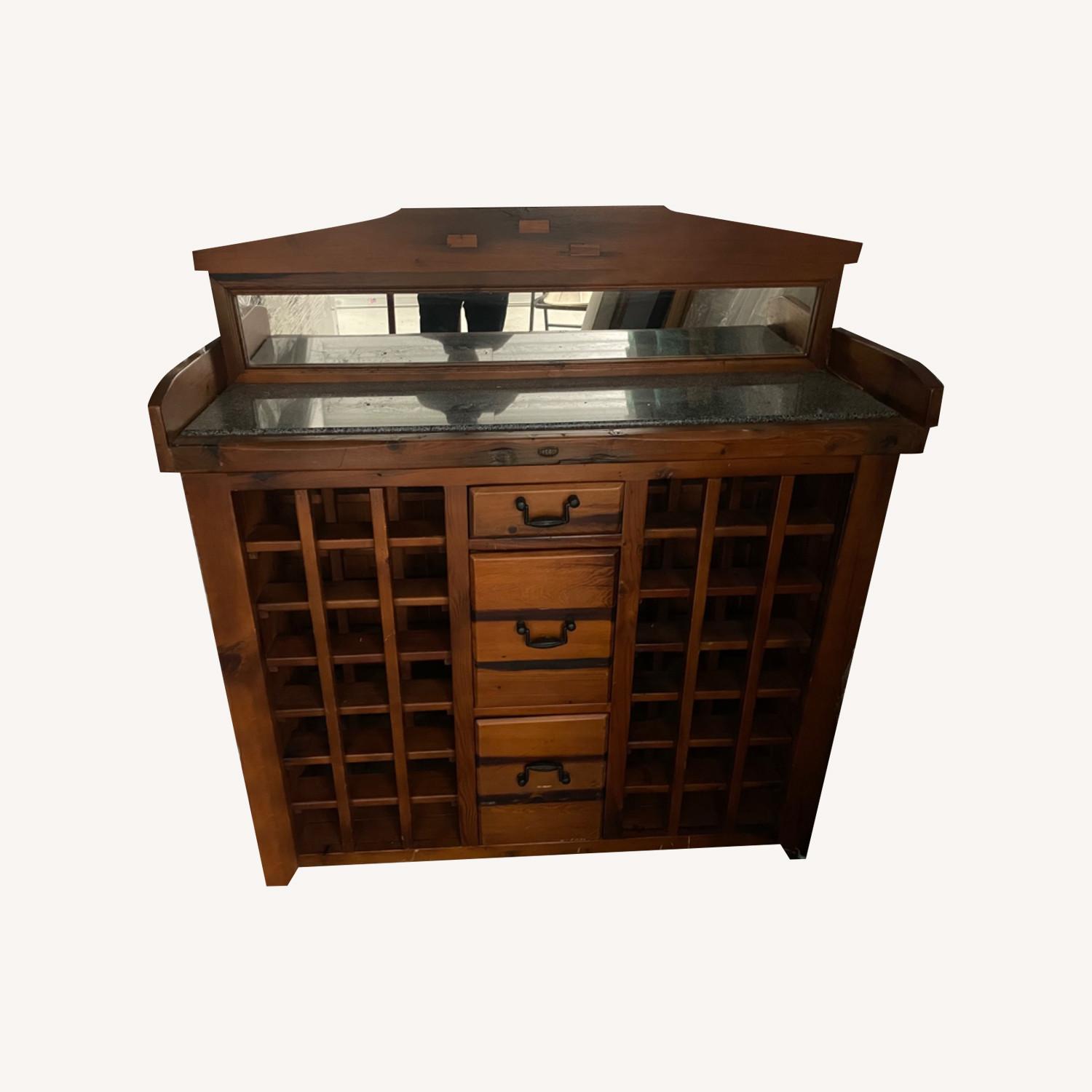 Seller's Notes:Recycled rail wood wine storage cabinet with marble top and mirror. Great condition except pics of time broken as shown in pic and needs to be glued/fixed. Stared in a temp controlled storage unit in Lincoln park area Chicago. Owner will be present at pickup. Dedicated parking and elevator building