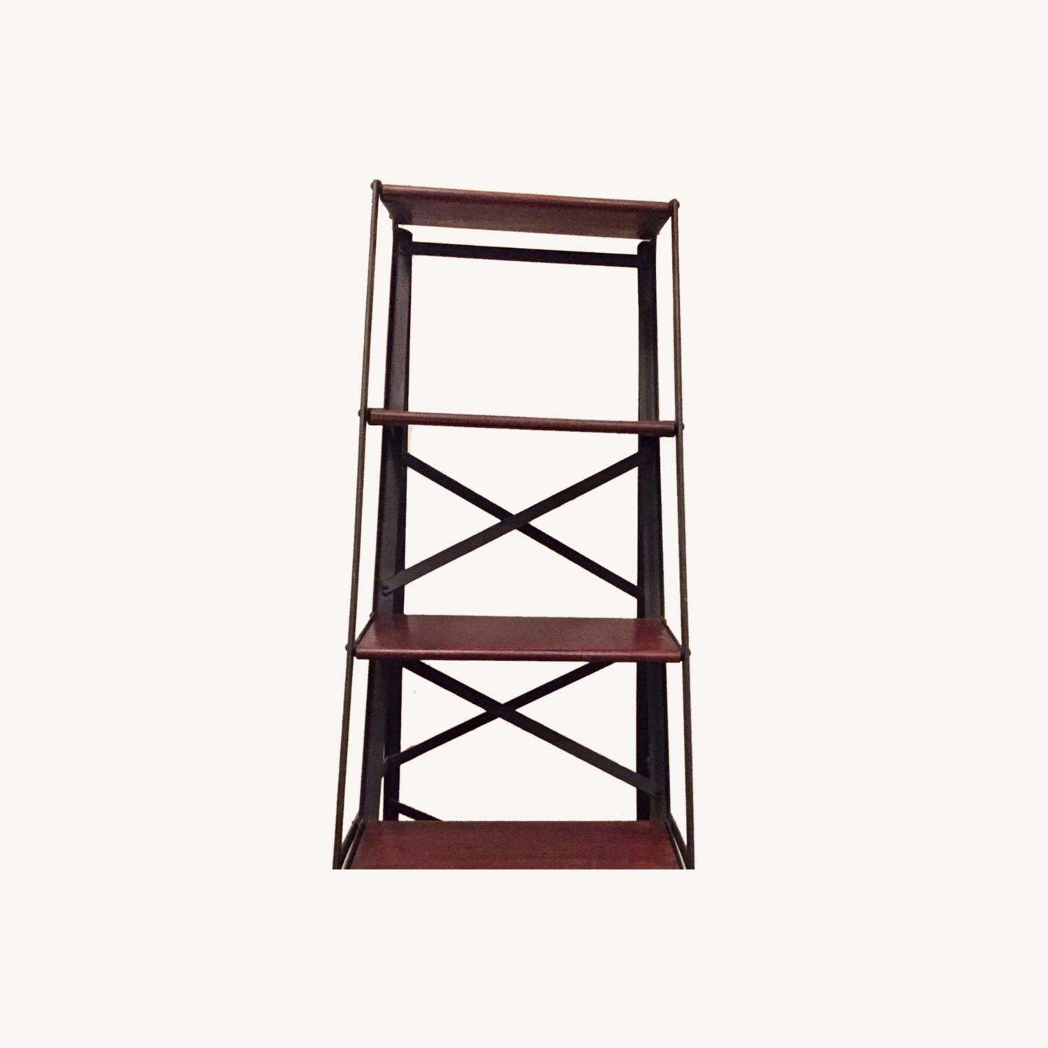 Seller's Notes:Antique wood - walnut and black metal "ladder" or bookcase. H is 48 inches, Shelf width 14 at top shelf - 15 at bottom DEPTH shelf at top is 14 and bottom 24 Very Heavy but sturdy could use as a ladder.
