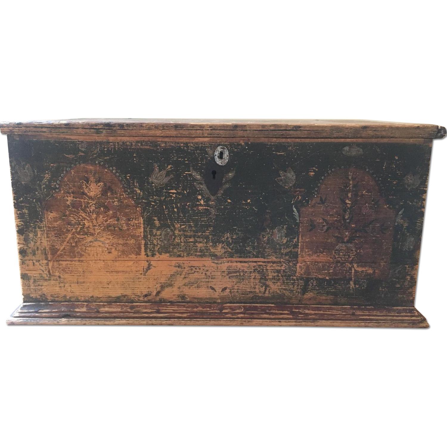 Seller's Notes:Antique chest imported from Czech Republic in 1996. We have used it as a coffee table (with a glass top), as a side table, and as a TV stand. Beautiful details and in great shape for being very old. The inside of the lid has an illustration of a saint (Barbara?). This is a good way to add storage to any room.