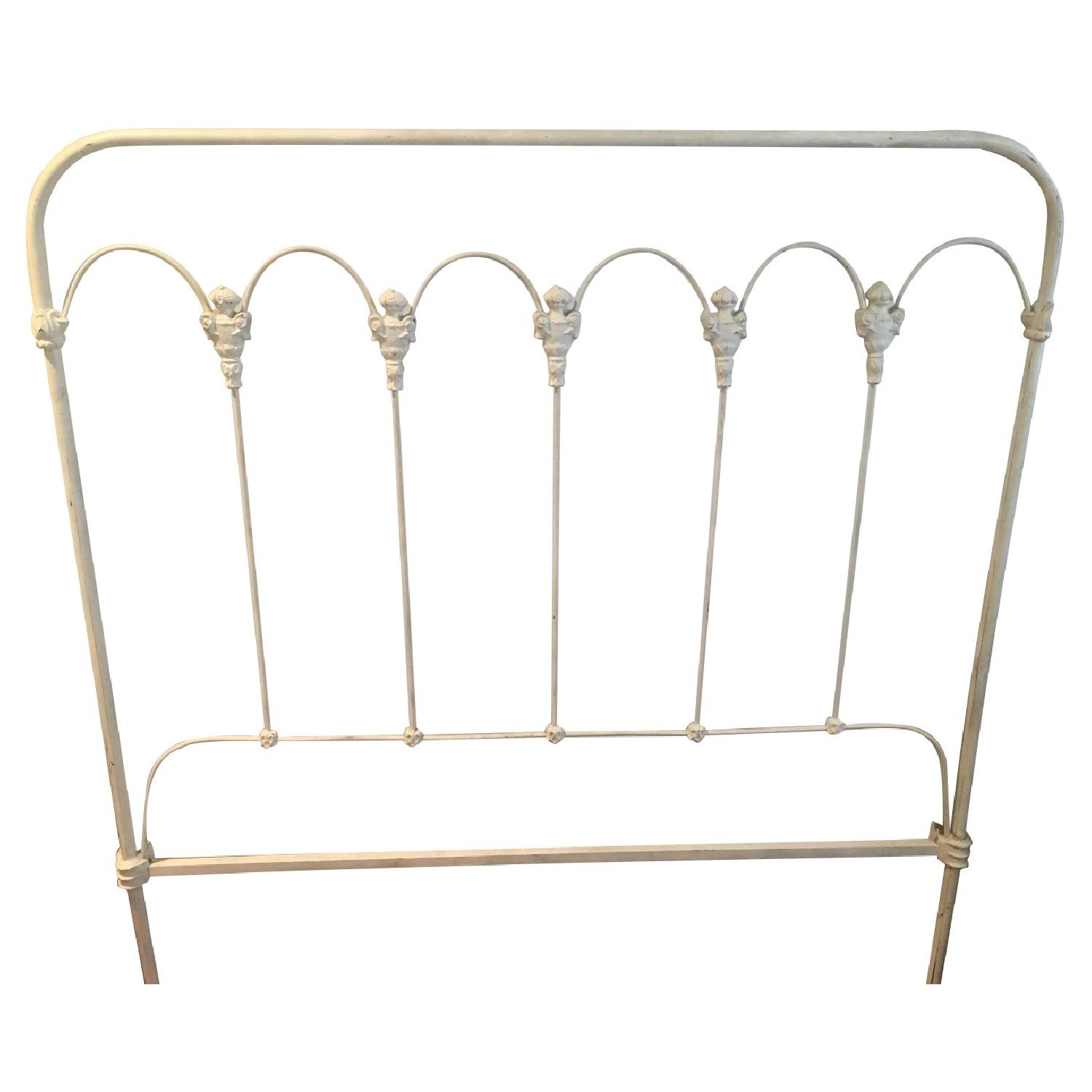 Seller's Notes:This antique wrought iron bed frame is a beautiful addition to any bedroom. It has an intentionally distressed feel with aged whitewash paint. It is a full size and requires a box spring. The bed is assembled without tools, nails or screws--it fits together with puzzle piece brackets. The entire frame is composed of eight pieces--1 headboard, 1 footboard, 2 iron side beams and 4 wooden planks that provide support. The under-bed space is about 14" tall--allowing plenty of space for under-bed storage.