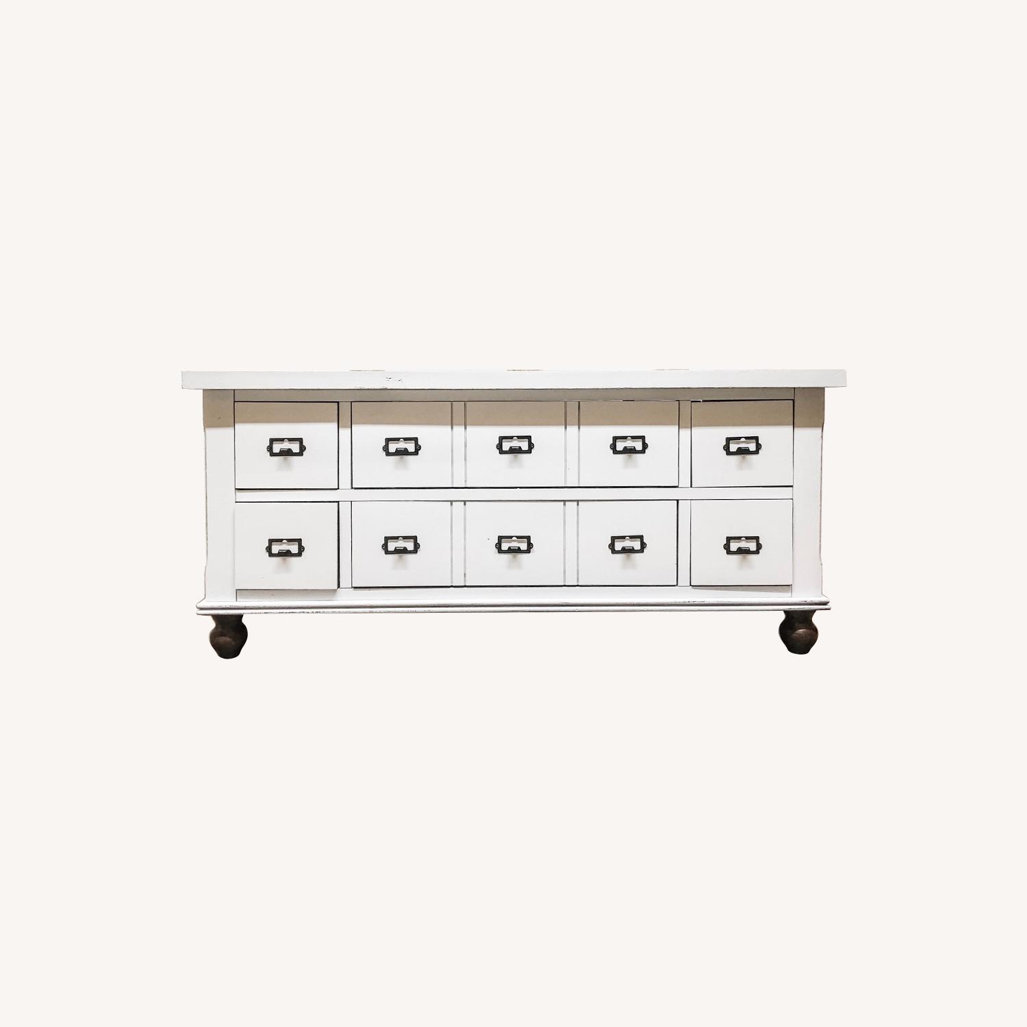 Seller's Notes:This unique little coffee table has gotten a farmhouse makeover! Featuring drawers on EACH SIDE that have new apothecary hardware and finished in a crisp white and sealed with cute little stained and distressed bun feet.