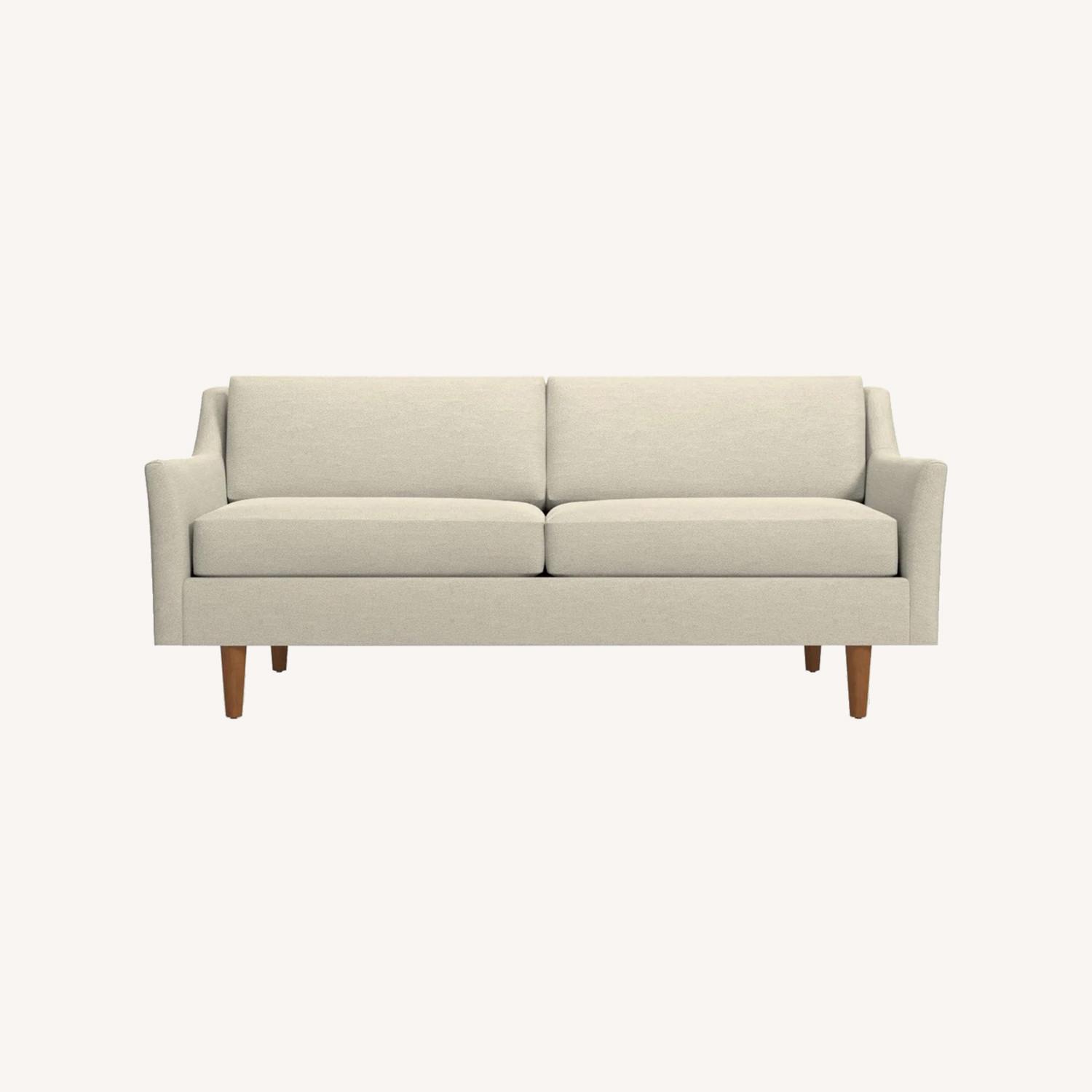 Seller's Notes:Gorgeous, mid century modern almond sofa with pecan legs. 9 months of use, no stains. Moving and cannot take with!