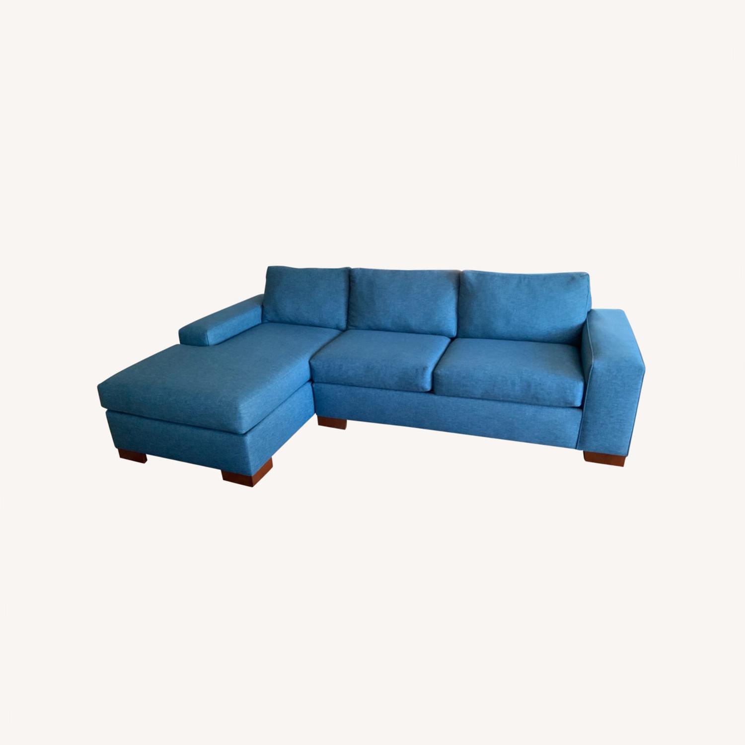 Seller's Notes:Apt2B Melrose 2PC Sleeper Sectional with Left-Facing Chaise, “Pecan” Leg Finish and “Regal” performance woven upholstery. Please note that chaise configuration is based on the position of the chaise while you are standing and FACING the sofa (NOT sitting on it). Purchased new and built to order in April 2021. Current retail price on Apt2B website is $5,658.00. “Regal” blue upholstery according to the Article2B website: performance woven 100% polyester bright woven blue with faint turquoise undertones. Double Rub Count: 100,000, kid and pet-friendly, spot and dry cleanable, Oeko-Tex Certified. No visible stains or stress to upholstery. Minor water stain on the inside of the chaise (see picture) but this is not at all noticeable unless chaise cushion is removed. Minor surface scratches to wood finish on 3 legs (see pictures) which can be easily touched-up. Zippered, removable cushion covers for easy cleaning. Smoke free, pet free home. Only selling because I am moving and the sofa is too big for my new space.