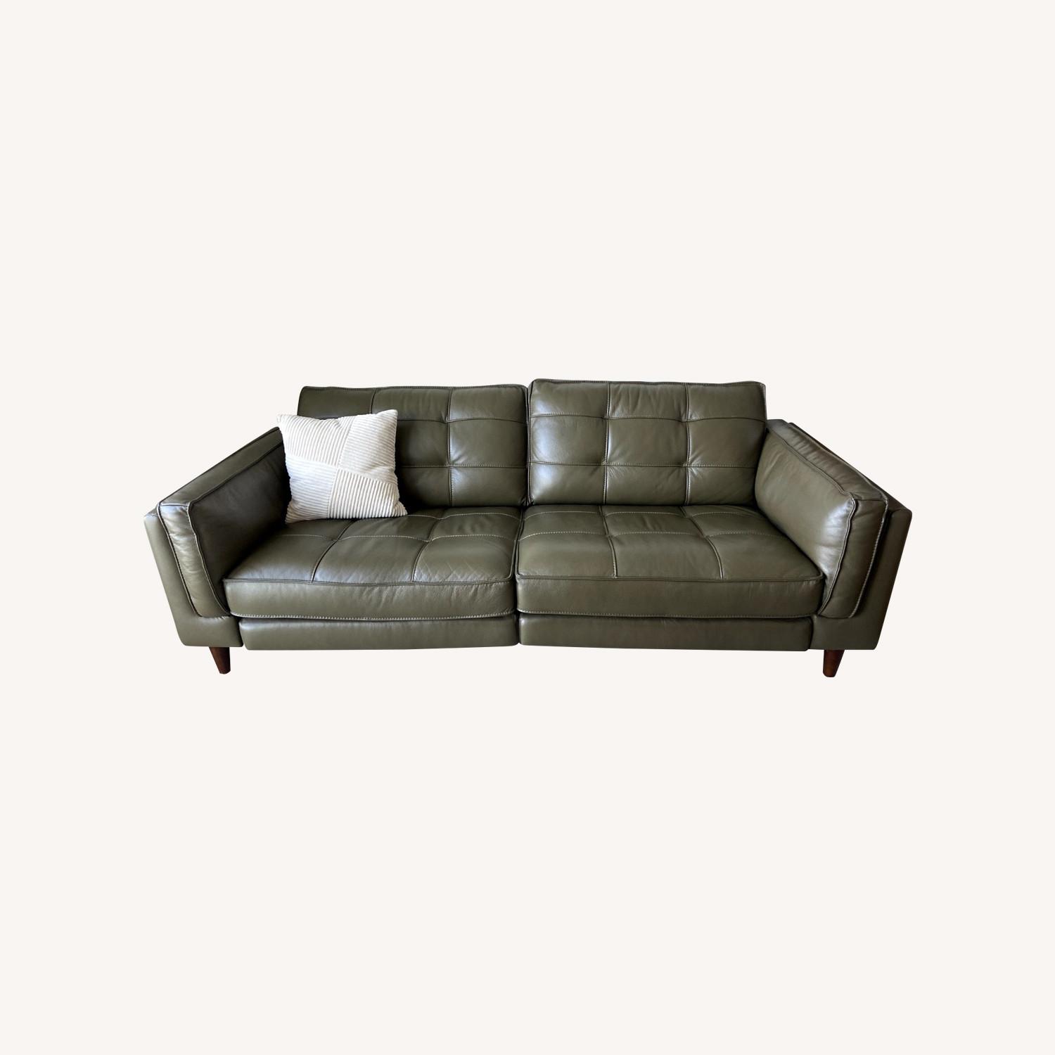 Seller's Notes:Olive green leather sofa from Apt 2B Keating Collection, no longer on the market. Very minimal use, looks like new. Includes electric footrests and recline functionality. Minor scratch on one arm, not noticeable to naked eye.