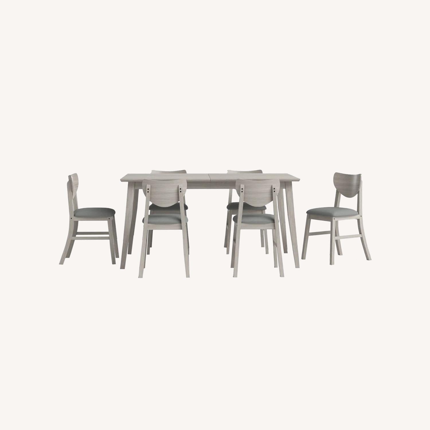 This 7-piece dining set invites family and friends to come together and enjoy casual meals and cozy coffee chats. It includes a rectangular table and six matching chairs, each piece crafted from solid and engineered wood. Angled, tapered dowel legs and a curved backrest on the chairs bring an iconic mid-century modern vibe to your space. Plus, a warm finish highlights the wood grain for a hint of rustic charm. The table measures 59" long to seat six people around it comfortably. And the seats are wrapped in neutral-toned fabric to round out the design.
