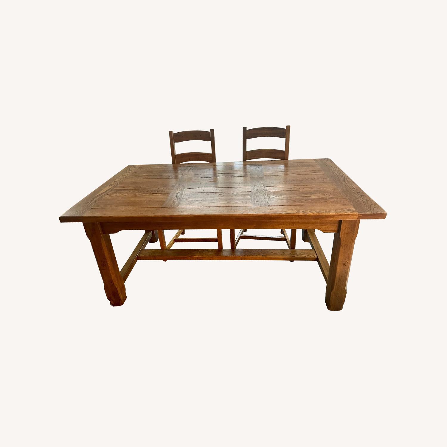 Seller's Notes:This 7-piece dining set was part of an Amish-made collection from Arhaus Furniture. The table and chairs are in good condition and feature a distressed farmhouse look. There are two leaves that slide into each end of the table to extend for additional seats. A total of 6 chairs are available to pair with the set. Measurements are included below. Base table: 71" long; 39.5" wide; 30.25" tall Leaves: 19.75" long; 39.5" wide Chairs: 41" floor to top; 17.75" floor to seat; 18" deep