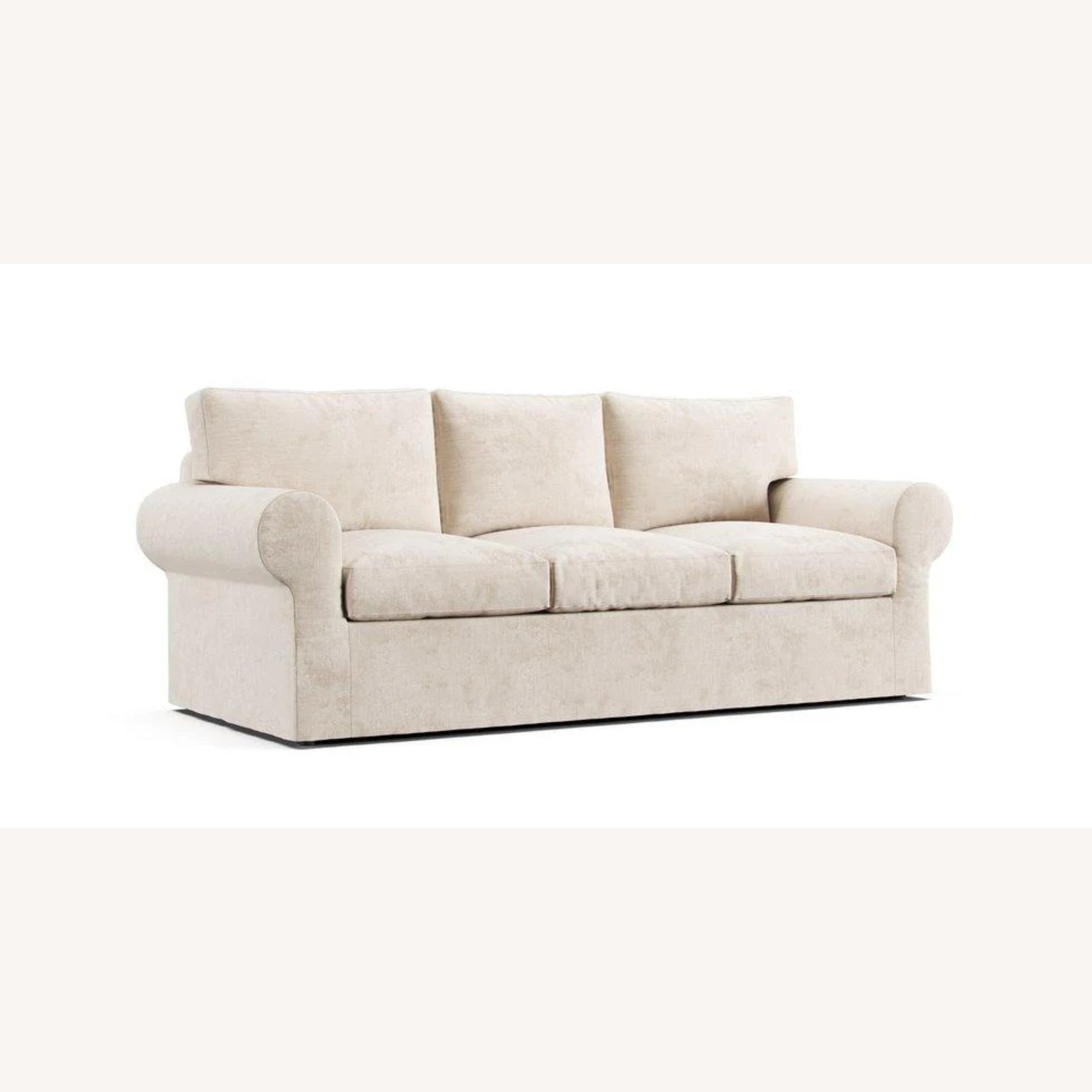 Seller's Notes:Arhaus Baldwin Couch Wheat colored - textured classic weave fabric Down stuffed cushions Back lengh: 81”, total length: 89”, depth: 38”, Back height: 32” Very good condition! No smoke/no children home - no stains, smells or scratches. one cushion seam is coming out but fixable and fits on back side of cushion so not visibility noticeable (~1” long, last pic)