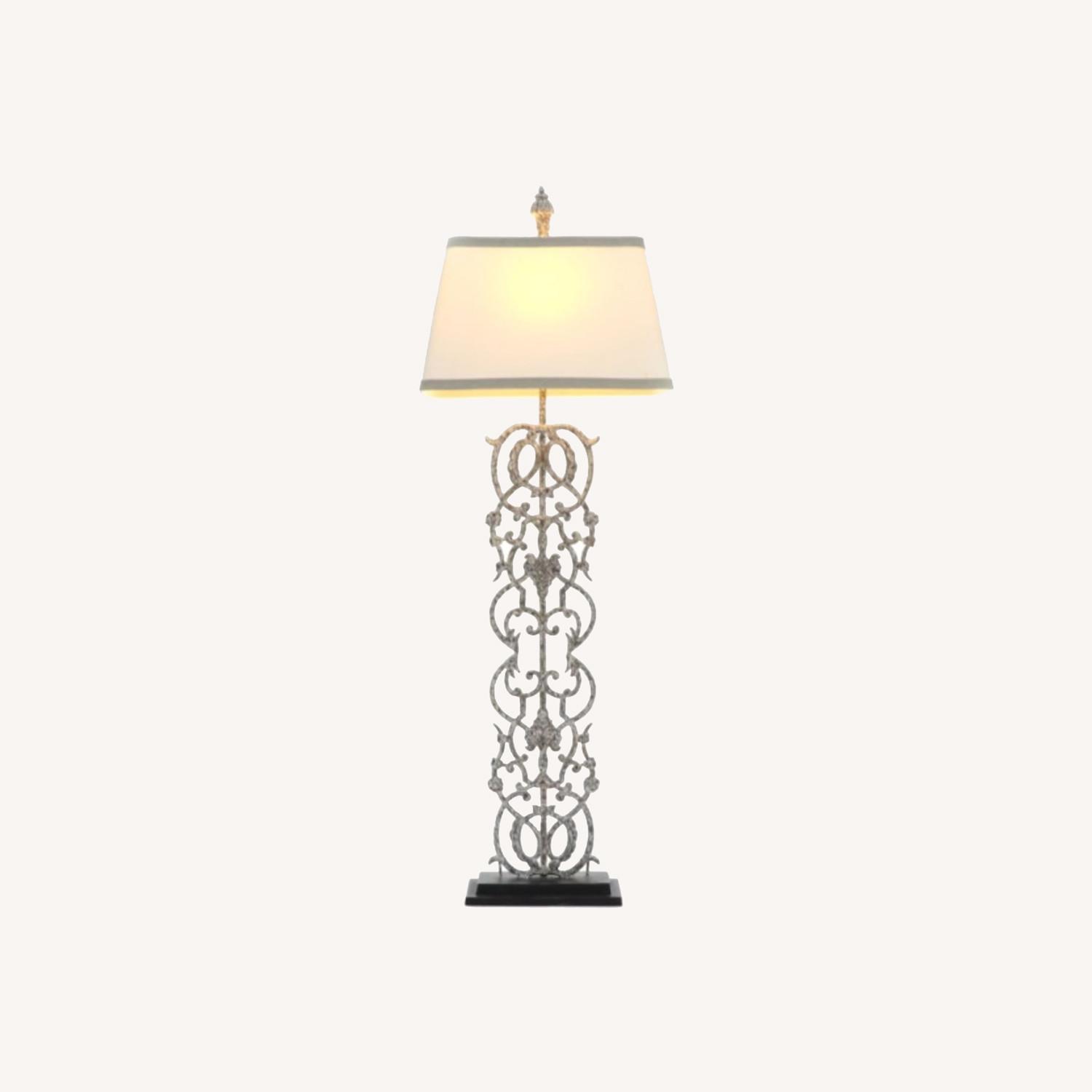 Seller's Notes:Excellent condition! Made of iron. This lamp is sturdy, gorgeous, and looks/feels like a piece of art. It is made to look aged/distressed and of course luxurious!! It's definitely a statement piece. The shade is clean/no stains. Two-toned linen fabric covers its firm shell that gives the shade its shape and durability. The base is a distressed, dark bronze color. The pix don't capture its full beauty and elegance.