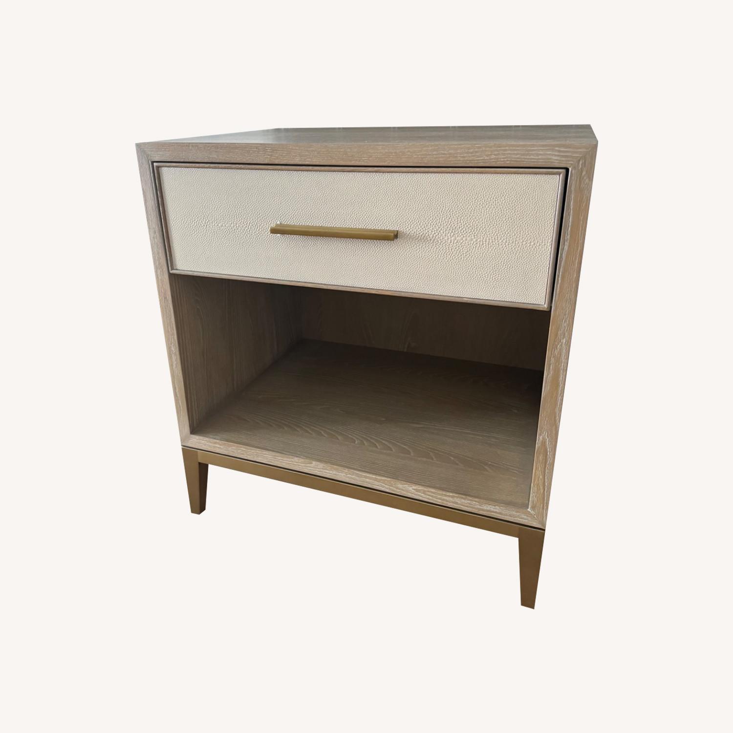 Seller's Notes:Great nightstands. Don’t fit in my room. Perfect condition. Pieces finished in Sparrow and Caramel feature craftsman-built frames made from solid parawood surfaced with walnut wood veneers. Pieces finished in Bone and Manta feature craftsman-built frames made from solid oak wood with elm wood veneers. Reconstituted leather insets are dyed and artfully embossed with textural shagreen detailing. Wood finishes are hand-stained and coated with lacquer for added protection. Metallic accents complement dark wood and leather surfaces. Drawers built using English dovetail joinery sit on under-mounted, soft-close glides. Keep essentials close with the ample storage options including open shelving and drawer space below.