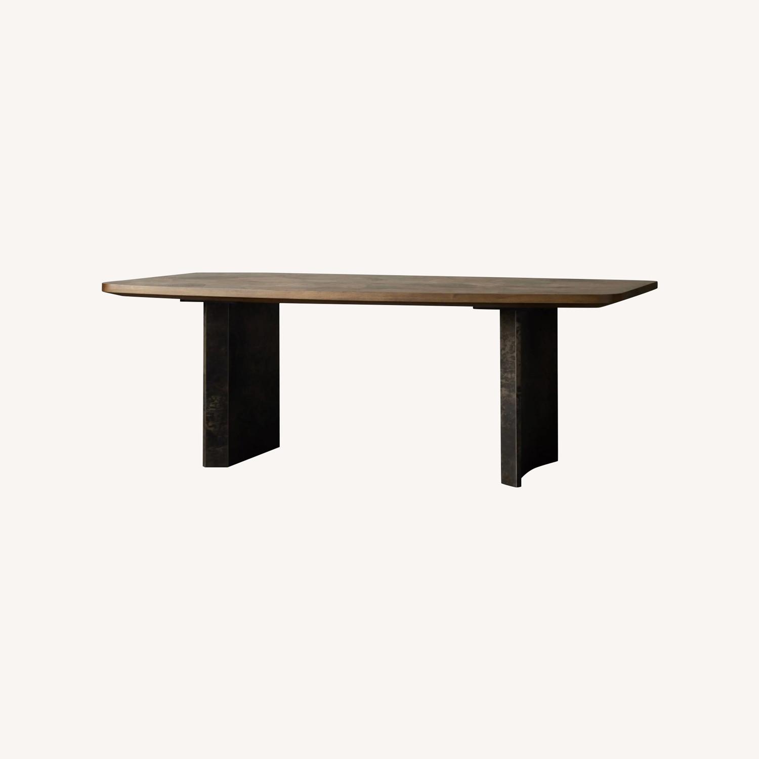 Seller's Notes:Transform your dining space with this stunning Arhaus Polanco Dining Table. Featuring a luxurious gray concrete top and a robust wood base, this table combines modern elegance with rustic charm, making it a perfect centerpiece for any dining room. Brand new, absolutely stunning dining table. Following heavy storms, our artisan partners in Mexico search the forest for fallen trees of Mexican ash, salvaging as many as they can. Each log is oyster-cut, arranged, and stained by hand, united with fragments of sustainably grown European ash burl to create incredible, mosaic-like surfaces. Bases crafted from naturally oxidized metal add the perfect contrast, together forming the rustic beauty of our remarkable Polanco Collection. - Handcrafted from oyster-cut fragments of salvaged Mexican ash and sustainably harvested European ash burl. - A hand-applied, reactive finish highlights the natural beauty and tonality of the wood. An acrylic lacquer is then applied for added protection. - Oyster-cut wood may display cracks and other organic features, including scorch marks, water stains, and natural graining, that will not affect the quality or performance of your piece. - Base is crafted from steel panels left out in the elements to weather, developing a rich patina of dimples and speckles as they age. - This collection is artisan-crafted from natural materials with hand-applied finishes. Individual pieces may vary in color, pattern, shape, and texture, making each truly unique. Details: Brand: Arhaus Model: Polanco Dining Table Top Material: Wood Base Material: Wood Condition: New Dimensions: 84" Width x 47.25" Depth x 30" Height Features: Seats 6-8