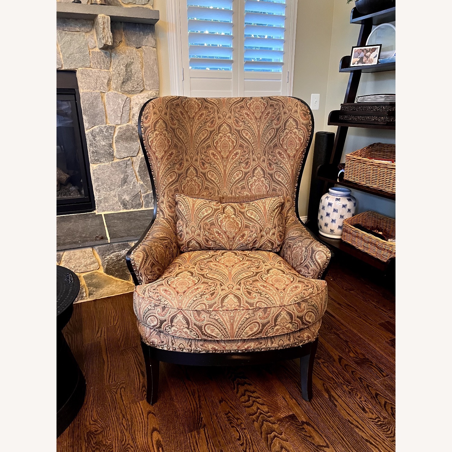 Seller's Notes:This wingback chair from the Arhaus Portsmouth collection features a dramatic silhouette. Upholstered in a durable and elegant fabric, the weathered dark frames of this stunning chair are left exposed to accentuate the wood’s natural characteristics. This chair’s rounded back is trimmed by decorative nailheads, while tapered legs complete the antique-inspired design of this handsome seating option.