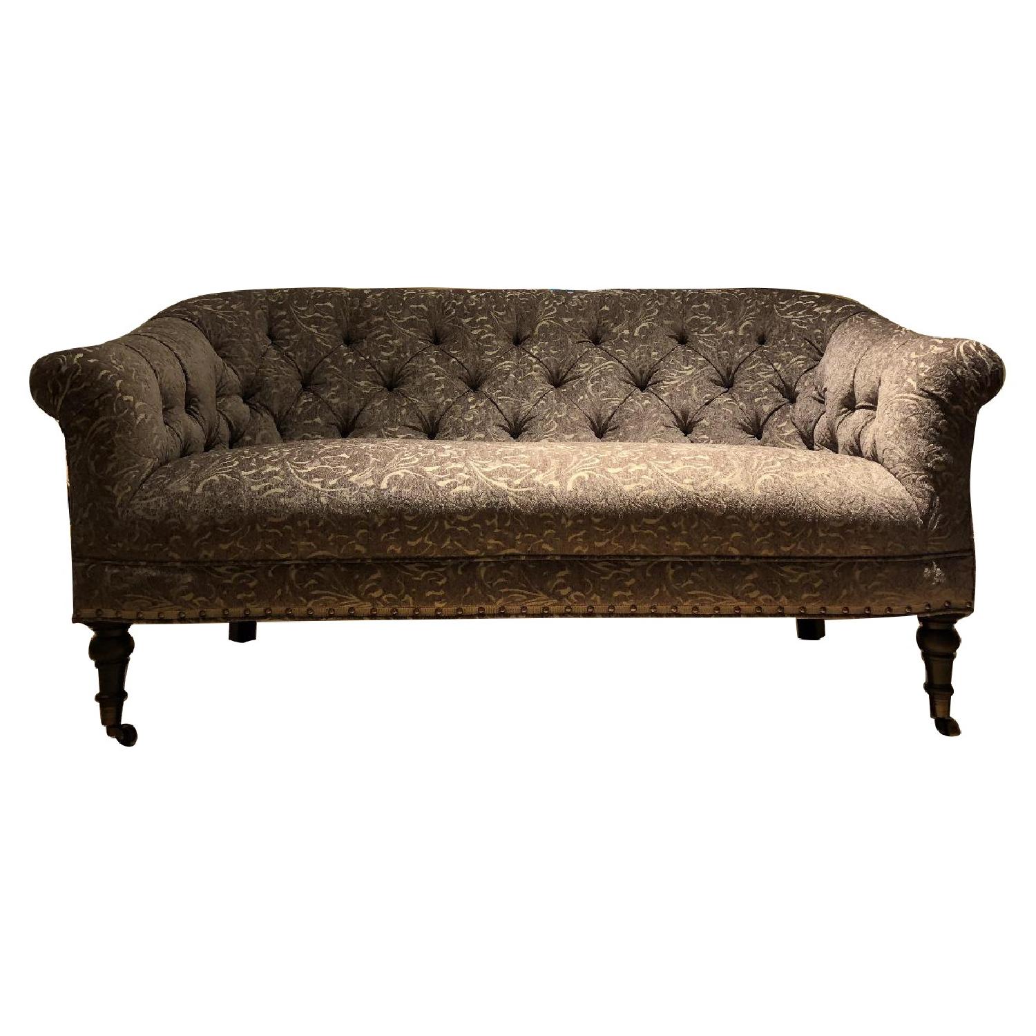 Seller's Notes:This is a vintage style settee with deep tufting, elegantly shaped, turned legs on casters. Upholstery fabric is "Vega Graphite"--brownish/gray, subtly patterned design that softly reflects light. (NOT stock color shown on Arhaus site.) Beautifully distinctive, but unobtrusive piece. Brass nailheads outline the base. Didn't fit our space.