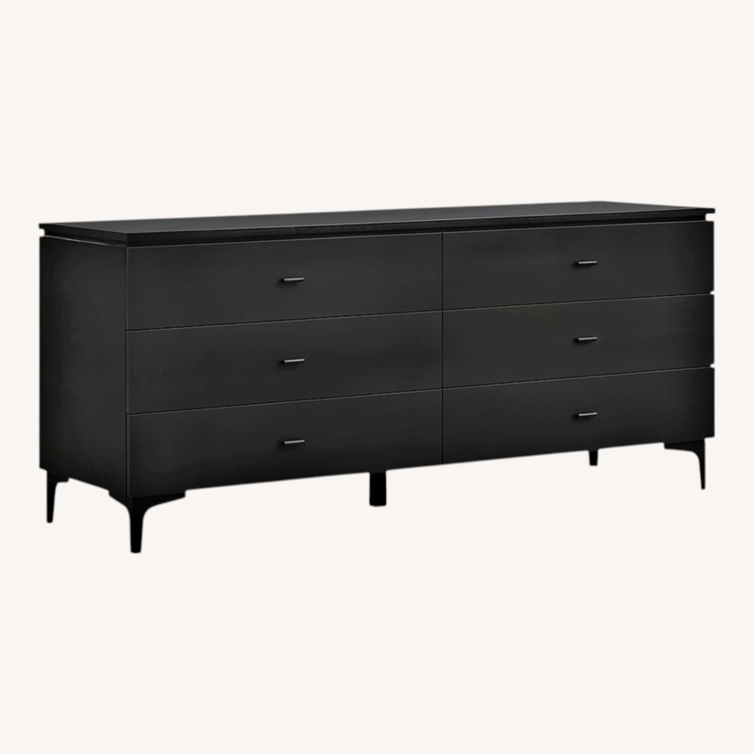 Seller's Notes:Had this dresser for a couple years. Still looks in perfect condition. Modern style with sleek black metal legs and drawer pulls. Moving and no longer need it. Description: Add a modern touch to your bedroom with the Legend Black Glaze Ash Veneer 6 Drawer Dresser with Metal Legs from Armen Living. It is the perfect piece for your bedroom and will add a certain richness to your room’s aesthetic. The design features a black finish that will surely help modernize the decor in your home. The four sleek metal tapered legs are crafted with sturdiness and durability in mind - giving you peace of mind for the longevity of this item. This spacious dresser features 6 drawers with a soft-closing gliding function - giving you ample space to declutter your bedroom. This dresser will make a simple storage solution to any well-appointed space in your home. Features - Part Of Legend Collection From Armen Living - Crafted From MDF with China Ash Veneer And Metal - Distressed Black Finish - Full extension drawer glides - 6 Drawers - Four sleek metal tapered legs Dresser Dimensions 63"W x 20"D x 28"H - 141lbs Drawer Dimensions 29"W x 12"D x 6"H - 33lbs