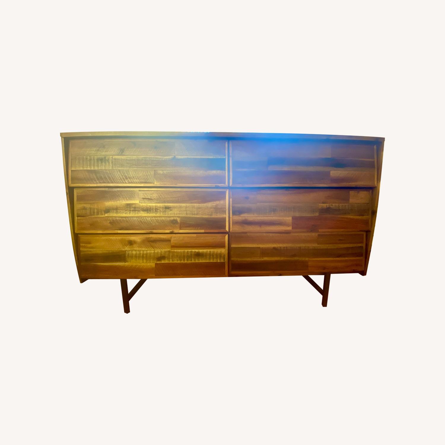 Seller's Notes:Beautiful solid acacia wood dresser by Armen Living featuring a rustic modern patchwork gain finish. Six spacious drawers glide smoothly; structure is solid and stable. The upper drawers are finished with soft black velvet interiors, adding a luxurious tactile contrast to the natural wood grain, ideal for storing jewelry or delicate items. Wood veneer perfectly maintained. The entire dresser is in excellent conditions like new. Rustic wood finish with intentional distressed look, very sturdy. Comparable Armen Living models retail for around $950-$1,100; priced here within a modest consignment range for quick sale.
