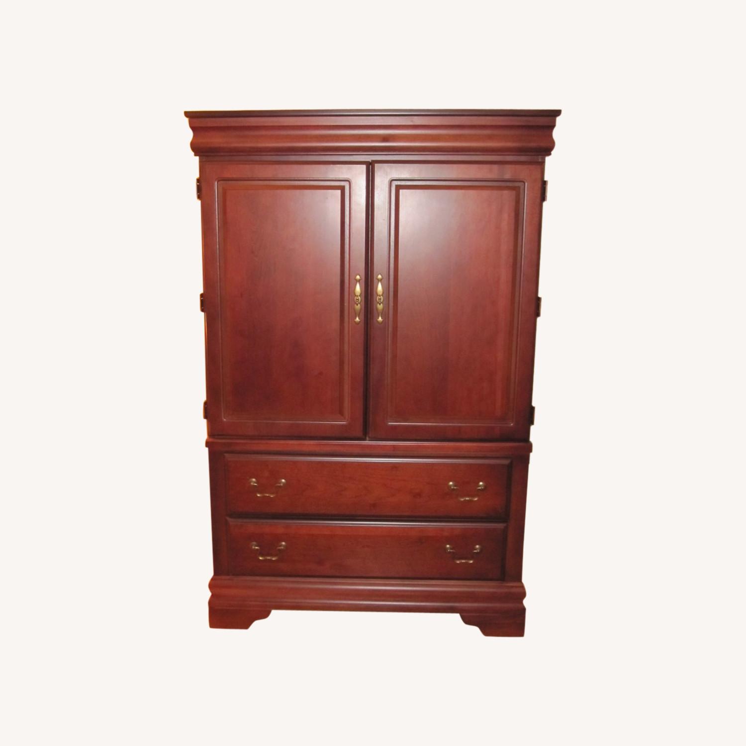 Seller's Notes:armoire - Cherry Wood- Upper 23shelves+ 2 drawers Predicted I was moving into Condo; staged setup never used or entertained and now selling; Seller is paying for pickup, delivery, assembly and logistics inclusive of insurance! If picking up, condo is on ground floor - no steps!